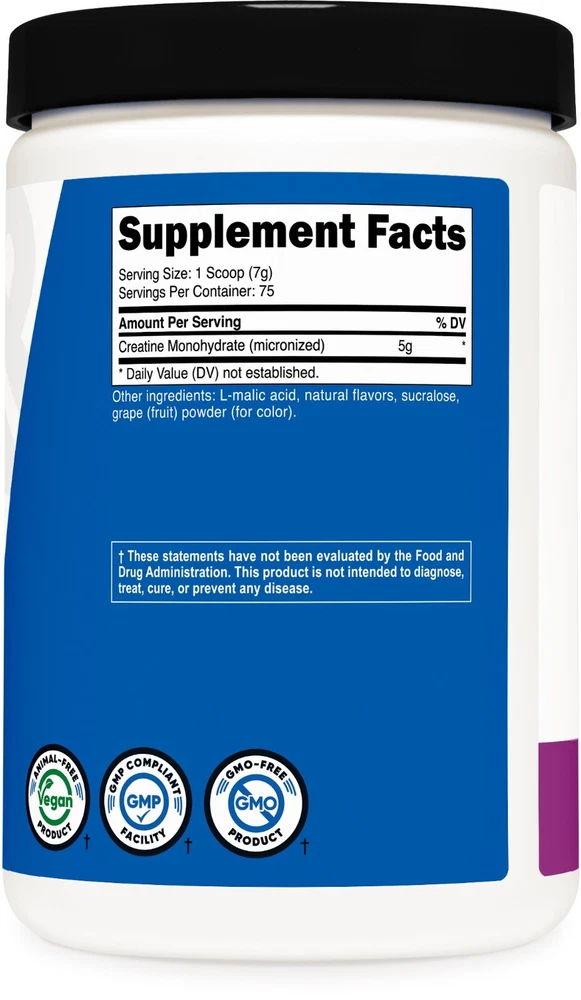 Welcome to the official eSupplements eBay store! Nutricost Creatine Monohydrate Powder (500G) (Grape) 100% Pure Creatine Monohydrate by Nutricost Nutricost's Flavored Creatine Monohydrate offers a convenient way to consume good tasting, high quality creatine monohydrate. Each scoop contains 7G of micronized creatine monohydrate. Nutricost's Creatine Monohydrate is Non-GMO and Gluten Free. Support Explosive Energy and Power Convenient and Flavorful: Nutricost's Creatine Monohydrate Grape flavor offers a delicious twist to your daily creatine intake, making it a pleasant addition to your fitness regimen. Micronized Creatine: Each serving of this product is packed with 5g of micronized creatine monohydrate, ensuring easy mixing and optimal absorption. Abundant Servings: A single bottle contains 500 grams of creatine, providing you with 75 servings, allowing for an extended supply to support your training goals. NSF Certified and GMP Compliant: Rest assured of the product's quality, as it is manufactured in an NSF certified and GMP compliant facility, meeting stringent industry standards. Independently Tested: To ensure purity and potency, every batch of Nutricost's Creatine Monohydrate undergoes independent testing by third-party, ISO accredited laboratories. Only 100% Pure Creatine Monohydrate No other binders or fillers, just pure creatine to give you the best absorption and best results! Q & A Q. How does Creatine Monohydrate work? A. Creatine, found in skeletal muscle as creatine phosphate, provides an inorganic phosphate to resynthesize ATP (energy) during high intensity activities. By increasing ATP production, creatine monohydrate helps to buffer changes in muscle acidosis and spare glycogen utilization, improving strength, muscle growth, and endurance. Q. Is Creatine Monohydrate safe for anyone to take? A. Creatine Monohydrate is safe for most people when used at recommended doses. Not enough is known about the use of creatine during pregnancy and breastfeeding to know if it is safe. Don’t use creatine if you have a kidney disease or diabetes. Q. How should I take Creatine Monohydrate? A. During the loading phase day 1 through 5, take 1 scoop four times daily. During the maintenance phase from day 6 forward, take 1 scoop daily. For best results, consume 1 scoop with 8-12 ounces of water or juice. Drink 8-12 glasses of water daily. Q. Will Creatine Monohydrate cause any side effects? A. Creatine is a combination of three natural amino acids and is found within the body. When used as directed, Creatine Monohydrate does not typically cause negative side effects. When taken in excessive doses, it may cause stomach pain, nausea, diarrhea, and muscle cramping. Q. Are there any warnings associated with this product? A. Do not exceed the recommended dosage. Despite being clinically proven to be safe, creatine, like many substances can be harmful if too much is consumed. Other than that, there is nothing to worry about when taking this product. Q. How fast will I see results? A. Everyone’s body is different. Some may see results in as little as a few days, while others will see results in a week or so. If you have an active workout regimen and solid diet, you will see results faster. Q. What are your shipping rates for the US? A. Shipping & Handling Domestic: Fast 2-5 business days shipping is 100% FREE Q. What are your international shipping rates? A. Shipping & Handling International: Expedited shipping is available for most countries. Rates may vary based on location and quantity. International customers (anyone outside the U.S. - including Canada & US protectorates) should be aware of and are responsible for all additional fees associated with duties, taxes, customs, and other costs incurred from shipping internationally. Your purchase includes courier fees only ***Please be aware it is against U.S. Law to underestimate the value of your package on the customs form. ***Please be aware we will not refund any international package that is refused. These additional costs vary depending on your location. Please refer to your local customs office to estimate these fees. ***Attention Alaska & Hawaii Customers Shipping may take up to 4-6 Business days