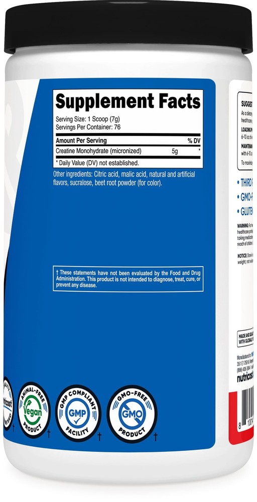 Nutricost Creatine Monohydrate Powder (Fruit Punch, 500 Gram (Pack of 1), Red Description Features: Delicious Flavors or Unflavored Creatine Available Micronized Creatine Monohydrate Promote Strength and Endurance Serving Size: 1 Scoop (Included) Made in a NSF Certified, GMP Compliant, FDA Registered Facility Product Details: Handling We will ship all orders within 1 business day of payment. Delivery We Do Not Ship Outside of the Continental US. Return Policy All items qualify for returns within 30 days of receipt. Buyer is responsible for return shipping on any item that is not damaged. Feedback We take our reputation seriously, we buy and sell online, so we understand the value of trust. If you are unsatisfied with your order, please contact us and we will work with you to resolve it to your satisfaction.