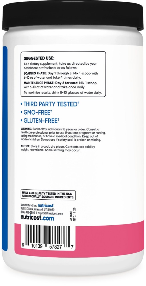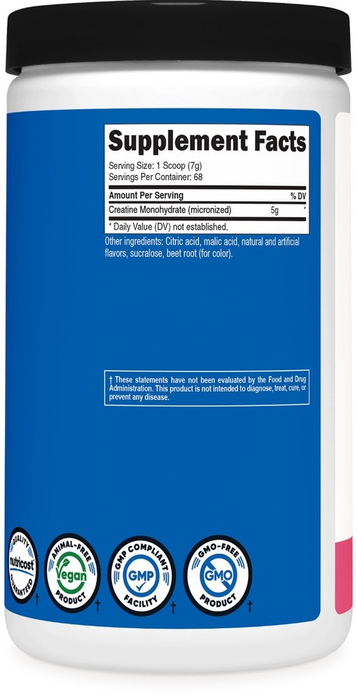 gtin13: 810139578277 Formulation: Powder Gender: Unisex Brand: Nutricost Supply: 2 Month and Longer Flavor: Sour Watermelon Department: Men, Unisex, Women MPN: NTC-10675 Active Ingredients: Creatine Monohydrate (Micronized) UPC: 810139578277 Type of Diet: Vegan, Vegetarian, Gluten Free Features: Gluten-Free, Non-GMO, Micronized Main Purpose: Bodybuilding, Fitness, Sports and Fitness Performance, Weightlifting, Gym & Training Country of Origin: United States Nutrition Facts Label: Yes Expiration Date: Approximately 2 Years Ingredients: Citric Acid, Creatine Monohydrate, Malic Acid, Natural and Artificial Flavors, Sucralose, Beet Root (for color) Type: Creatine Item Weight: 20.4 oz Dosage: 5 Grams