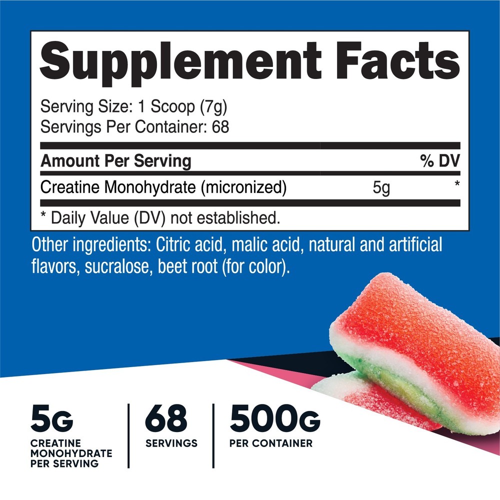 Nutricost Creatine Monohydrate Powder (Sour Watermelon, 500 Gram) - Micronized Creatine Supplement, Vegan, GMO-Free, Gluten-Free, 68 Servings Micronized Creatine Monohydrate by Nutricost Features micronized creatine monohydrate in bold Sour Watermelon flavor Includes 500 grams of creatine powder per bottle Provides 5 grams of creatine monohydrate per serving with an easy-to-use scoop Ideal for use before, during, or after workouts Manufactured in an NSF Certified, GMP Compliant, FDA Registered Facility Nutricost Creatine Monohydrate Powder brings a refreshing twist to a classic supplement with its bold Sour Watermelon flavor. The micronized creatine blends smoothly with liquids, making it easy to add to your daily beverages without gritty texture. Each bottle contains 500 grams of powder, offering approximately 68 servings, and includes a convenient 5-gram scoop to keep measuring simple and consistent. This flavored creatine powder offers flexibility in how and when you choose to enjoy it, whether mixed on its own or combined with other favorite drink mixes. It also aligns with a variety of dietary preferences, as it is vegan, gluten-free, and made with GMO-free ingredients. Designed with both convenience and taste in mind, Nutricost Creatine Monohydrate makes it easy to incorporate creatine into everyday routines. Q & A Q. How should I take Creatine Monohydrate? A. During the loading phase day 1 through 5, take 1 scoop four times daily. During the maintenance phase from day 6 forward, take 1 scoop daily. For best results, consume 1 scoop with 6-10 ounces of water. Drink 8-10 glasses of water daily. Q. Will Creatine Monohydrate cause any side effects? A. Creatine is a combination of three natural amino acids and is found within the body. When used as directed, Creatine Monohydrate does not typically cause negative side effects. When taken in excessive doses, it may cause stomach pain, nausea, diarrhea, and muscle cramping. Talk with your health-care professional to see if creatine is right for you. Q. Are there any warnings associated with this product? A. Do not exceed the recommended dosage. Despite being clinically proven to be safe, creatine, like many substances can be harmful if too much is consumed. Other than that, there is nothing to worry about when taking this product however you should always consult with your health care professional if you have any questions about the use of this product or any other supplement. Q. How fast will I see results? A. Everyone’s body is different. Some may see results in as little as a few days, while others will see results in a week or more or so. If you have an active workout regimen and solid diet, you will most likely see results faster. Q. What are your shipping rates for the US? A. Shipping & Handling Domestic: Fast 2-5 business days shipping is 100% FREE Q. What are your international shipping rates? A. Shipping & Handling International: Expedited shipping is available for most countries. Rates may vary based on location and quantity. International customers (anyone outside the U.S. - including Canada & US protectorates) should be aware of and are responsible for all additional fees associated with duties, taxes, customs, and other costs incurred from shipping internationally. Your purchase includes courier fees only ***Please be aware it is against U.S. Law to underestimate the value of your package on the customs form. ***Please be aware we will not refund any international package that is refused. These additional costs vary depending on your location. Please refer to your local customs office to estimate these fees. ***Attention Alaska & Hawaii Customers Shipping may take up to 4-6 Business days