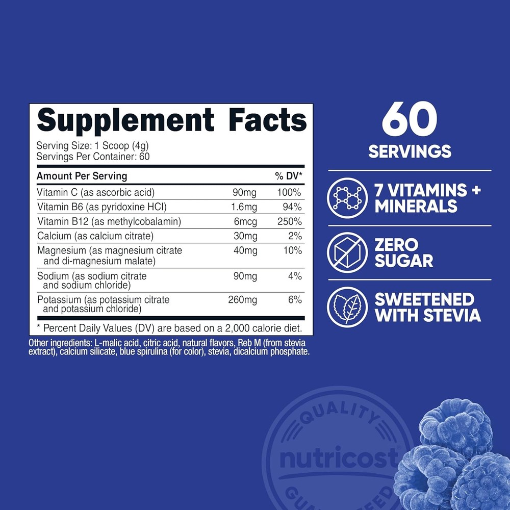 Nutricost Electrolyte Complex Powder (60 Servings, 60 Servings (Pack of 1) Description Features: Optimal Hydration Formula: Contains a balanced blend of electrolytes, vitamins, and minerals to support hydration and replenish the body’s essential electrolytes. Versatile Use: Ideal for use throughout the day or before, during, or after workouts to enhance hydration anytime you need an electrolyte boost. Easy to Use: Simply mix with water for a refreshing and revitalizing drink that aids in rapid hydration. Quality and Safety: Manufactured in a GMP Compliant facility, ensuring high standards of production and safety. Third-Party Tested: Each batch undergoes rigorous testing by independent laboratories, ensuring product purity and potency. Product Details: Product Dimensions : 3.5 x 3.5 x 2.87 inches; 10.6 ounces Item model number : NTC-10617 Manufacturer : Nutricost Brand: Nutricost Flavor: Blue Raspberry Unit Count: 8.4 Ounce Item Form: Powder Item Weight: 10.6 Ounces Item dimensions L x W x H: 3.5 x 3.5 x 2.87 inches Product Benefits: Hydrating Package Information: Bottle Number of Items: 1 UPC: 810139573319 Handling We will ship all orders within 1 business day of payment. Delivery We Do Not Ship Outside of the Continental US. Return Policy All items qualify for returns within 30 days of receipt. Buyer is responsible for return shipping on any item that is not damaged. Feedback We take our reputation seriously, we buy and sell online, so we understand the value of trust. If you are unsatisfied with your order, please contact us and we will work with you to resolve it to your satisfaction.