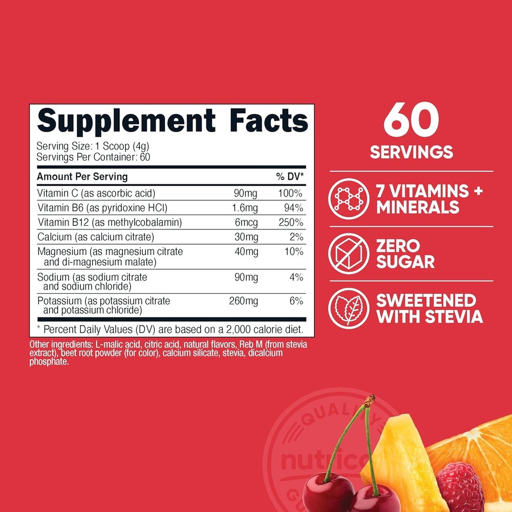 Nutricost Electrolyte Complex Powder (60 Servings, 60 Servings (Pack of 1) Product Details Product Dimensions : 3.5 x 3.5 x 2.87 inches; 10.5 ounces Item model number : NTC-10620 Manufacturer : Nutricost Brand: Nutricost Flavor: Fruit Punch Unit Count: 8.4 Ounce Item Form: Powder Item Weight: 10.5 Ounces Item dimensions L x W x H: 3.5 x 3.5 x 2.87 inches Product Benefits: Hydrating Age Range (Description): Adult Package Information: Bottle Number of Items: 1 Optimal Hydration Formula: Contains a balanced blend of electrolytes, vitamins, and minerals to support hydration and replenish the body’s essential electrolytes. Versatile Use: Ideal for use throughout the day or before, during, or after workouts to enhance hydration anytime you need an electrolyte boost. Easy to Use: Simply mix with water for a refreshing and revitalizing drink that aids in rapid hydration. Quality and Safety: Manufactured in a GMP Compliant facility, ensuring high standards of production and safety. Third-Party Tested: Each batch undergoes rigorous testing by independent laboratories, ensuring product purity and potency.