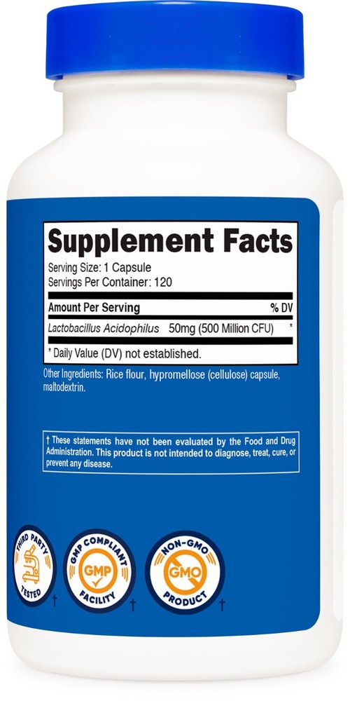 Ingredients: Lactobacillus acidophilus, Rice Flour, hypromellose (cellulose) capsule, maltodextrin Department: Unisex Expiration Date: Approximately 2 Years UPC: 810139575207 Number of Pills: 120 capsules gtin13: 810139575207 Country/Region of Manufacture: United States Main Purpose: General Wellness MPN: NTC-22057 Item Weight: 3.8 oz Brand: Nutricost Features: Gluten Free, Non-GMO Age Group: Adult Type: All-in-One Product Dosage: 1 capsule with 8-12 oz of water Formulation: Capsule