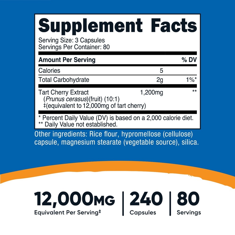 Welcome to the official eSupplements eBay store! Nutricost Tart Cherry Extract (12,000mg Equivalent) 240 Capsules - Vegan, GMO-Free, Gluten-Free, 80 Servings Nutricost Tart Cherry Extract (12,000mg) - 240 Servings Product Description Nutricost Tart Cherry has 1200mg of Tart Cherry Extract at a 10:1 ratio for an equivalent of 12,000mg Each bottle contains 240 easy-to-swallow vegan Tart Cherry Extract capsules, offering 80 full servings for long-lasting supply Tart cherry is known for its naturally occurring phytonutrients and antioxidants GMO-free, Gluten-free, and Vegan – suitable for various dietary needs Manufactured in an NSF Certified, GMP Compliant, FDA Registered Facility Tart Cherries are rich in antioxidants and are a great addition to your daily regimen. High Quality Tart Cherry! Q. Is there a return policy? A. We offer a 30 day money back guarantee from the time of delivery of your purchase. Any unopened products in resalable condition will receive a full refund of the product sale price. Customer is responsible for shipping costs. Up to one opened product can be returned for a full refund within that time period. No other opened or damaged product will be accepted. Please contact our customer service department using your eBay message system for instructions on how to return your product. Q. What are your shipping rates for the US? A. We offer Free Domestic shipping. Q. Do you offer international shipping? A. Shipping & Handling International: We have fast international shipping available to most countries. Rates may vary by location and order size. International customers (anyone outside the U.S. - including Canada & US protectorates) should be aware of and are responsible for all additional fees associated with duties, taxes, customs, and other costs incurred from shipping internationally. Your purchase includes courier fees only * These statements have not been evaluated by the Food and Drug Administration. This product is not intended to diagnose, treat, cure or prevent any disease. ***Please be aware it is against U.S. Law to underestimate the value of your package on the customs form. ***Please be aware we will not refund any international package that is refused. These additional costs vary depending on your location. Please refer to your local customs office to estimate these fees. ***Attention Alaska & Hawaii Customers Shipping may take up to 4-5 Business days