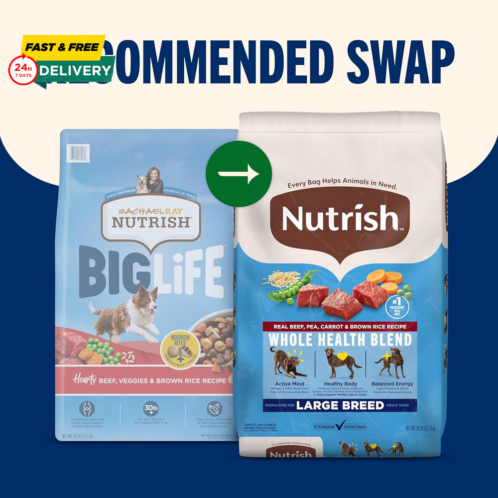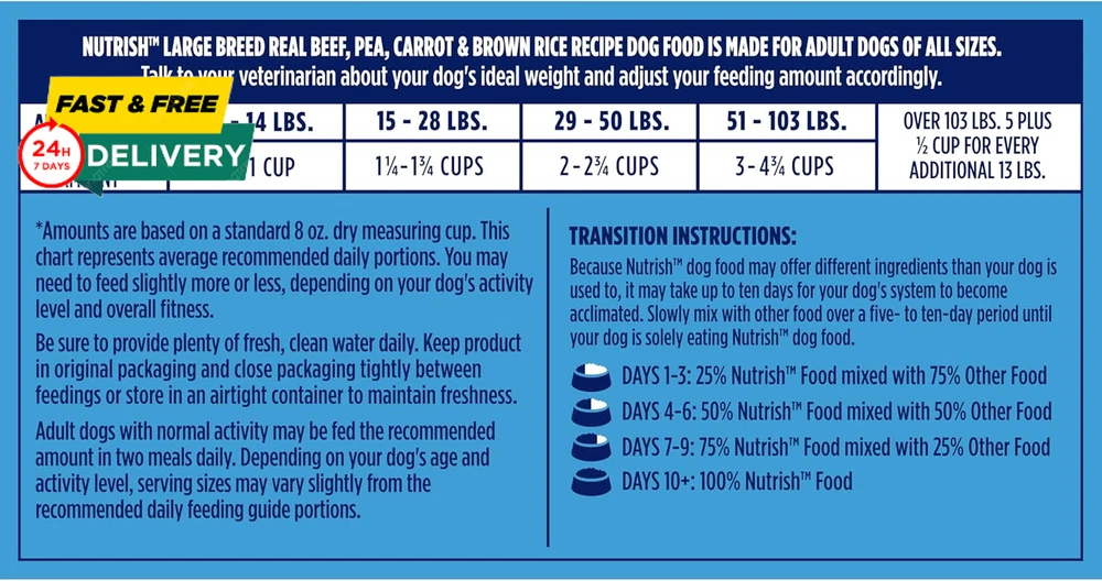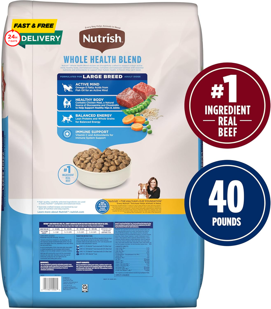 Menu Other Items Feedbacks About Us Contact Us Add To Favorites Nutrish Large Breed Real Beef, Pea, Carrot & Brown Rice Recipe Whole Health Blend Dry Dog Food, 40 Lb. Bag (Rachael Ray) Contains one (1) 40-pound bag of large breed dog food Real Beef is the #1 Ingredient, providing protein to help support lean muscle mass and healthy organs Formulated for large breed dogs with glucosamine and chondroitin to support healthy hips and joints Natural food for dogs with added vitamins, minerals & nutrients Nutrish Large Breed Recipes have many of the same benefits as Rachael Ray Nutrish Big Life with the added benefits of Whole Health Blend Looking for a great large breed dog food? Try Nutrish Large Breed Real Beef, Pea, Carrot & Brown Rice Recipe. This premium dry dog food for large dogs is made with real beef as the #1 ingredient—giving your dog a great source of protein to help support lean muscle mass and healthy organs. It also has chicken meal, a natural source of glucosamine and chondroitin to help support healthy hips and joints. Plus, this Whole Health Blend recipe is carefully designed to support your dog’s active mind, healthy body and balanced energy. Not only will your best friend love the tasty flavor of beef dog food, but you’ll also feel good knowing that a portion of your purchase goes to The Rachael Ray Foundation to help animals in need. Grab a bag and treat your big dog to the delicious, nutritious food they deserve—all while making a difference. Item Specification Age Range Description Adult Number of Items 1 Brand Name Nutrish Brand Ogefine Age Range (Description) Adult Package Dimensions 29 x 20 x 5.5 inches; 40.35 Pounds Specific Uses For Product Large Breed Item Weight 18.3 Kilograms Manufacturer Post Consumer Brands Target Audience Keyword Dogs Flavor Name Beef, Pea, Carrot & Brown Rice Flavor Beef, Pea, Carrot & Brown Rice Size 40 Pound (Pack of 1) Item Form Chunk Specific Uses for Product Large Breed Item Package Dimensions L x W x H 29 x 20 x 5.5 inches Breed Recommendation Large Breeds Dimensions Shipping Returns Additional Info Product Dimensions: 20.0 inches x 29.0 inches x 5.5 inches. Weight: 18.3 kg Fast shipping is very important for us. Our standard shipping service is FREE. Your order will be shipped within 1-3 business days upon full payment received. Most items are delivered within 3-5 business days, however, please allow 3-10 business days. We are shipping only to USA. We only ship to the confirmed Paypal address. We reserve the right to cancel any order for any reason at any time. We are not responsible for undeliverable addresses. We offer a 30 day return policy from checkout winning date. Your satisfaction is guaranteed! If for any reason you are unhappy with your item, just return it within 30 days for a full refund, minus shipping cost. Please contact us prior to initiating a return so that we can issue you a refund authorization. Items defective upon receipt must be packaged in their retail packaging as if new and returned with a detailed description of the problem. Return shipping fees are not refundable. We reserve the right to decline any returns if the above guidelines are not followed. All of our items, unless otherwise stated, will only run on 120 volts. Please check to make sure your country complies with these specifications. If you have a problem or question regarding your transaction please contact us before leaving any type of feedback. We will work with you to resolve any problem you may have.