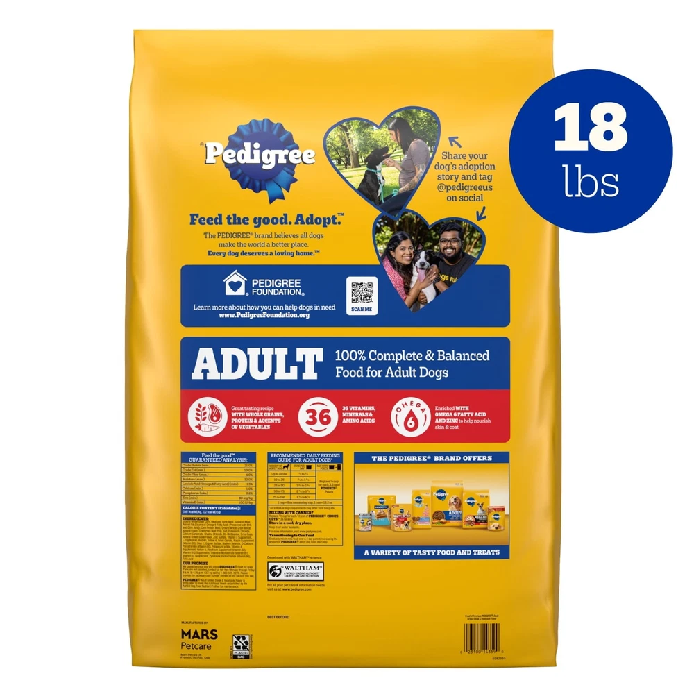 Dogs bring out the good in us. Pedigree dog food brings out the good in them. Express your love for your dog by serving Pedigree Complete Nutrition Adult Dry Dog Food, Grilled Steak & Vegetable Flavor recipe. Made with only natural flavors for great taste in every bowl, this healthy dog food recipe supports their everyday health and natural vitality and is formulated with 36 vitamins, minerals, and amino acids. It also contains high-quality protein to support lean muscles, prebiotic fiber to support healthy digestion, and 6 Fatty Acid and Zinc to help nourish a healthy skin and coat. This recipe is made with the finest ingredients from around the world. With no high fructose corn syrup, artificial flavors, or added sugars, Pedigree Complete Nutrition Adult Dry Dog Food, Grilled Steak & Vegetable Flavor shows your dog that you care and have great taste. Pedigree dog food is 100% complete and balanced adult dog food for healthy nutrition Made with 36 vitamins, minerals, and amino acids to support everyday health & vitality This high quality protein dog food supports lean muscle Digestible dog food made with only natural flavors and prebiotic fibers to support healthy digestion Dry dog food fortified with vitamins & minerals to support a healthy immune system