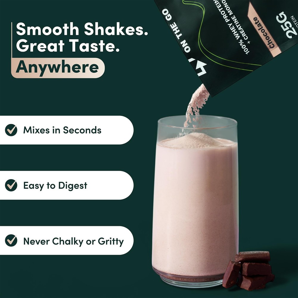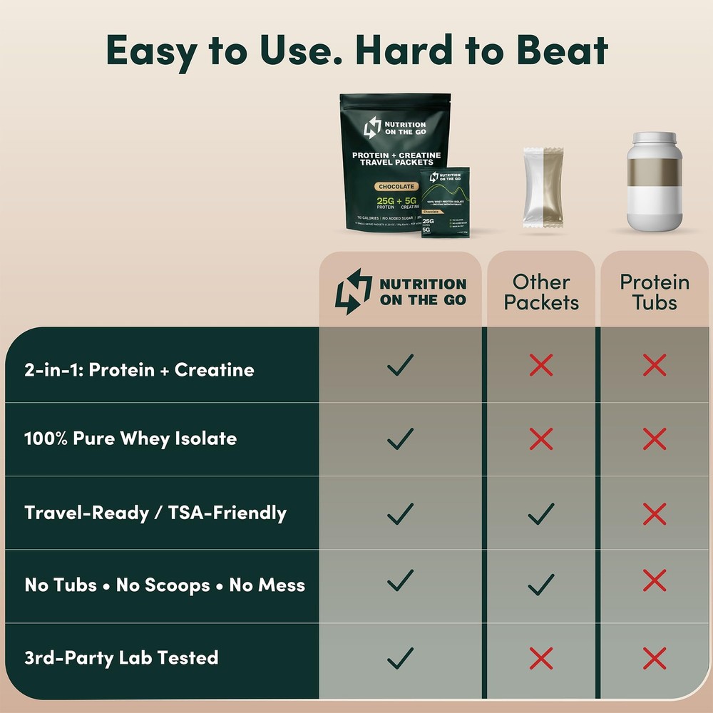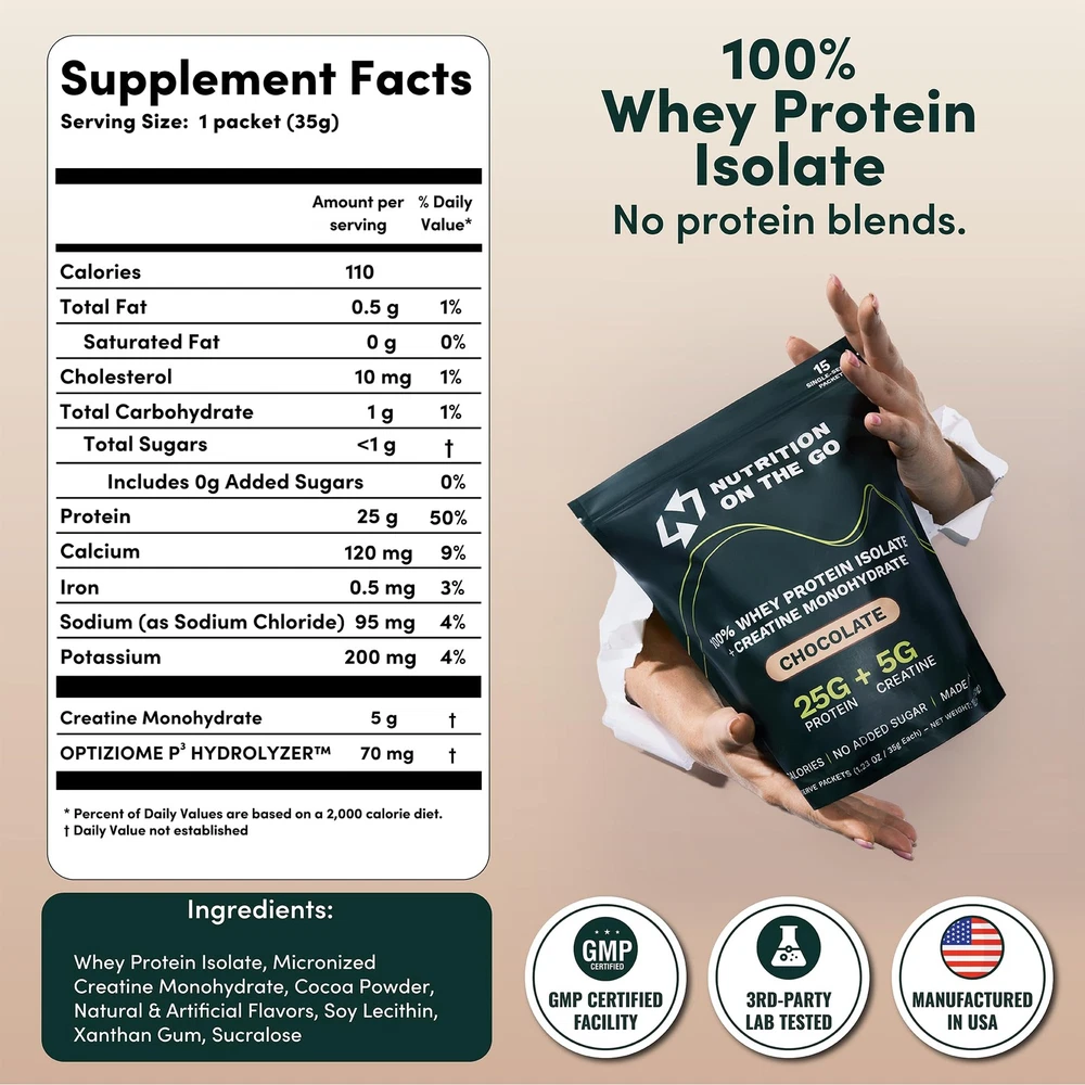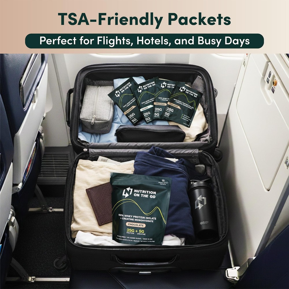 π Product Description TRAVEL-READY PROTEIN PACKETS: Pre-measured single-serve packets designed for life on the go. TSA-friendly and easy to pack in carry-ons, gym bags, and backpacks so you never miss your protein while traveling, working, or training. Includes 15 individual chocolate packets.,PROTEIN + CREATINE 2-IN-1: Each packet delivers 25g of 100% whey isolate protein and 5g of micronized creatine monohydrate to support muscle, strength, and daily performance in one simple serving.,NO TUBS, NO SCOOPS: Skip the bulky containers and messy measuring. Tear open a packet, pour, shake, and go with perfectly portioned servings and zero cleanup.,NO CLUMPS, CLEAN TASTE: Mixes smoothly in water or milk with no clumps or gritty texture. Clean, easy-to-drink taste without the chalky texture common in many protein powders.,EASY TO DIGEST: Formulated with 100% whey isolate, which is naturally lower in lactose than traditional whey concentrates, plus digestive enzymes for smoother digestion and less stomach heaviness. Gluten-free and made without unnecessary fillers. π Specifications size 15 Packets itemWeight 1.50 pounds manufacturer Nutrition On The Go productDimensions 8.5 x 2.0 x 11.0 inches β Fast Shipping | β Quality Guaranteed | β Customer Support 30-Day Returns β’ 100% Satisfaction