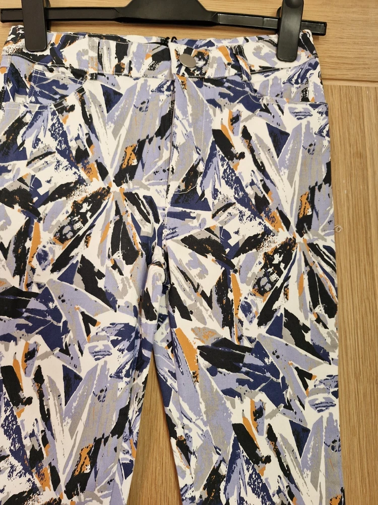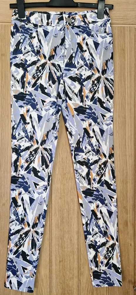 This is a pair of blue print canvas jeans in size Small 8/10 by the brand Sophyline. The jeans feature a geometric pattern, a zip closure, and a high rise waist of 28/30 inches. Made of cotton and elastane fabric with a medium wash, the slim-fit jeans have a skinny style and come with a 5-pocket design. They offer a slimming effect, stretch, and are machine washable, making them suitable for all seasons.