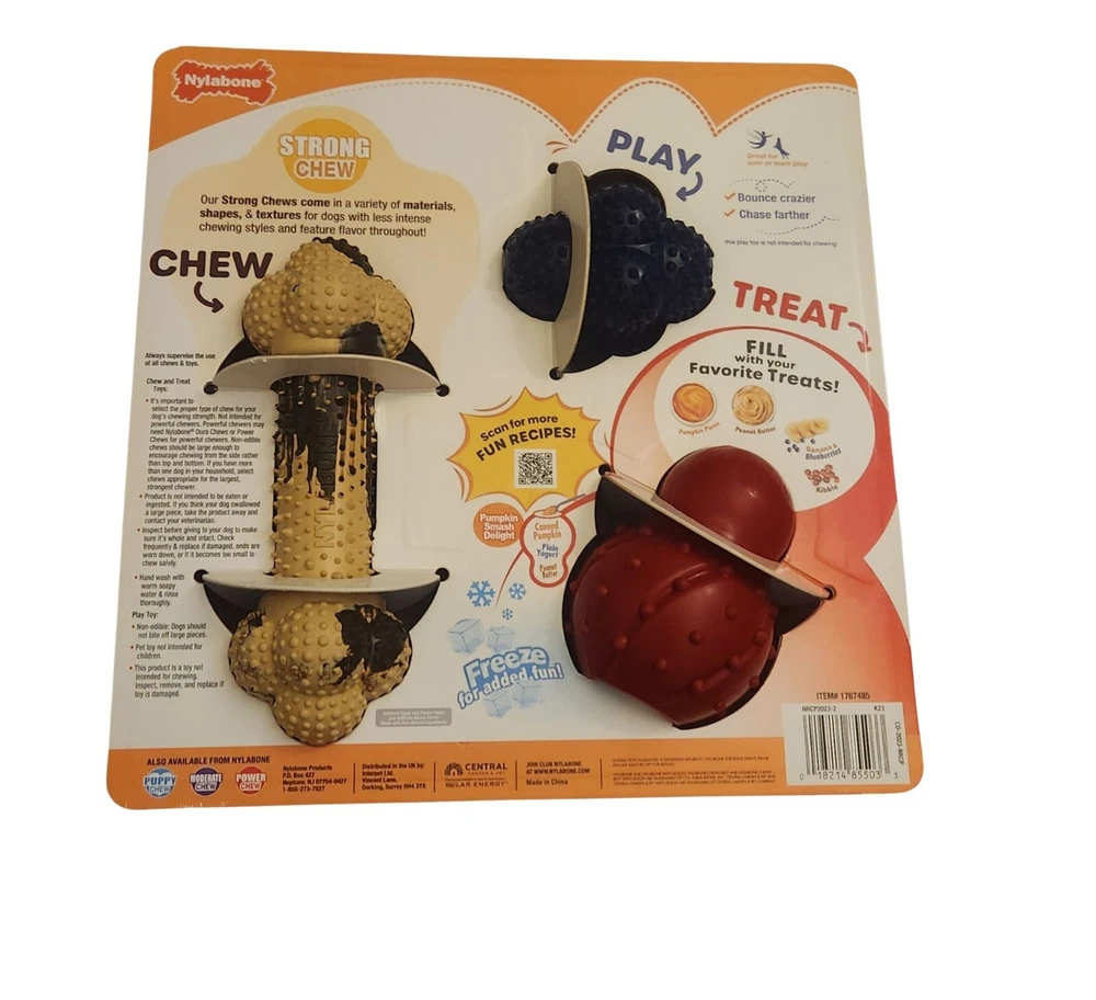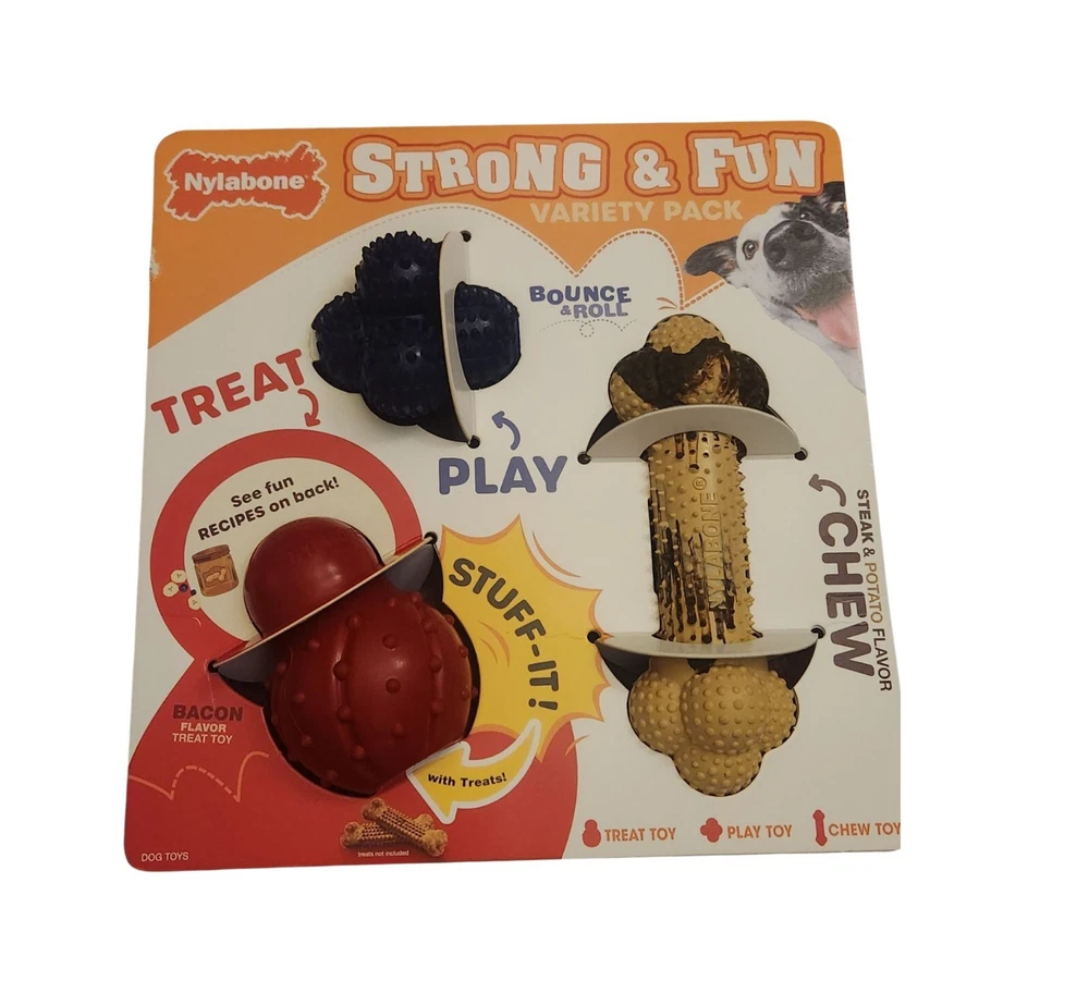 Nylabone Super Tough Rubber Strong and Fun Chew Toy Variety Pack 3 Count. Our strong chews come in a variety of materials shapes and textures for dogs with less intense chewing styles and feature flavor throughout! Contains 3 unique Power Chew toys. * Strong chew for dogs * Tough dog toys designed to entertain and engage * Curvy shape features ridges and nubs to help clean teeth * Ergonomically designed with an arched shape for comfortable chewing Directions Product is not intended to be eaten or ingested. If you think your dog swallowed a large pice, take the product away and contact your veterinarian. Inspect before giving to your dog to make sure is whole and intact. Check frecuently & replace if damaged.