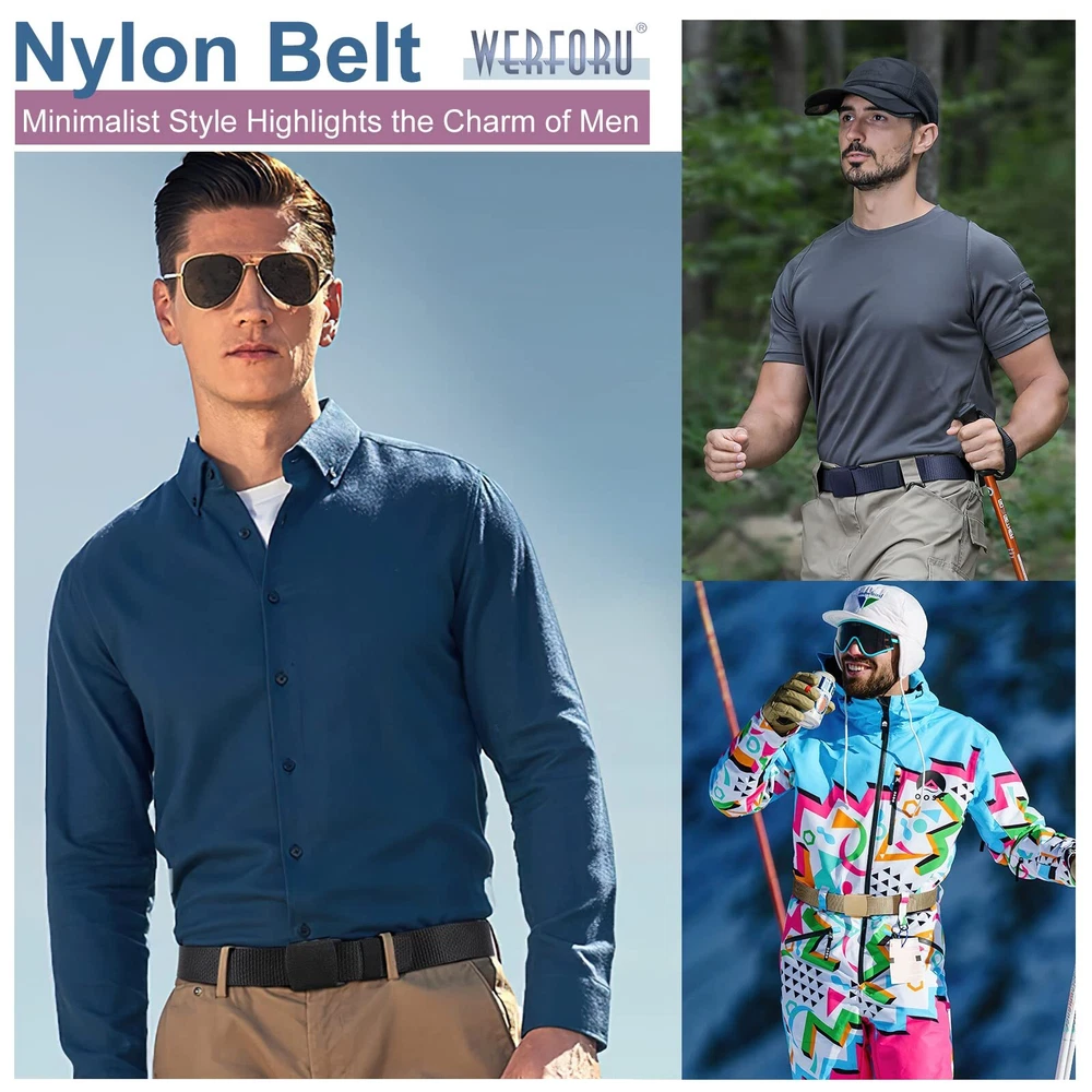 QUALITY NYLON BELT-- Premium nylon webbing, lightweight, soft, breathable,flexible, sturdy and durable, sweat absorption and dry fast. Compare with the leather belt, the nylon belt won’t be cracked and aged after long times using. PLASTIC BUCKLE DESIGN---Designed with metal-free plastic buckle, which is not easy to crack and breakage. Nickel free plastic buckle, feel comfortable and easy to wear. Non-metallic buckle belt allow you a easy/quick clearance at the security checkpoint at the airport. And especially suitable for metal allergy to wear. VARIOUS COLLOCATION---We have 2 pack,3 pack,4 pack nylon belt for your choice.Different colors nylon belt meet your different daily wear needs. Lightweight, quick dry, comfort nylon material strap with plastic buckle suitable for daily wearing with all pants, and outdoor heavy duty work or sports (hiking pants, ski pants, snow pants etc). A great gift for your friend and relatives! OCCASION---Available in black,khaki,blue,gray ,coffee 5 colors for choose,enough quantity and color to match all your daily outfit. This nylon belt is not only for daily wear, but also more suitable to outdoor sports, such as: climbing mountains, hiking, golf, hunting, fishing ,skiing and so on. FULLY ADJUSTABLE---6 size for your choice,meet most people needs. Belt strap width is 1.5 inches,easy to pass through most pants. No holes belt design, so its tightness and length can be adjusted freely to meet different wearing requirements. If the strap is too long for you, you can trim the strap length to fit your size. The ratchet buckle design makes the belt non-slip, stay tight full day.