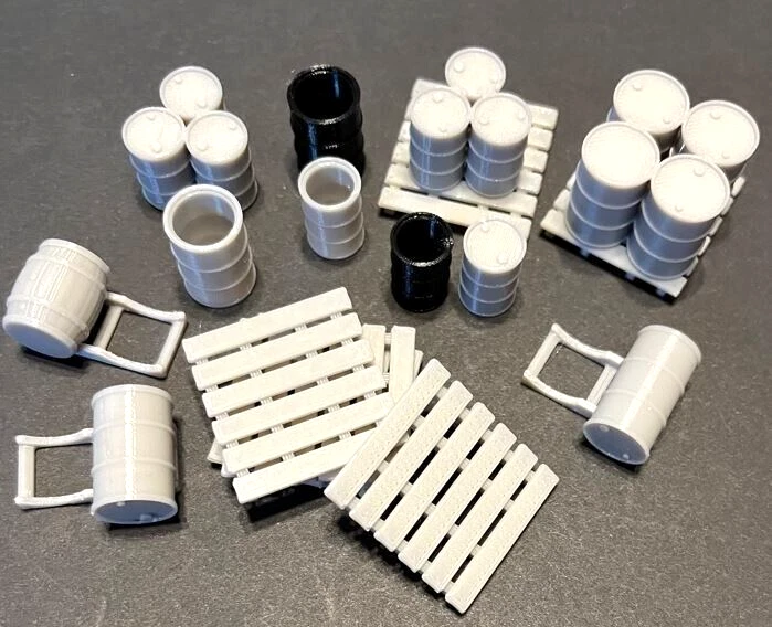 O GAUGE ASSORTED BARRELS, STANDS, PALLETS AND DRUMS Lot includes 18 assorted O gauge can include 30 and 55 gallon drums closed and opened, 6 heavy duty pallets and 3 barrel stands. These items will enhance any layout (see photos). The assortment of barrels and drums may vary from the photos. These are unpainted. Designed and 3D printed in the USA using top quality strong and long lasting PETG plastic. (Extra pallets for these Drums and Barrels can be purchased on Ebay) eBay item number: 175789707656 Shipping cost will be discounted and a refund given if more than one of any of my Ebay items can be shipped in the same carton. Shipped USPS First Class Mail