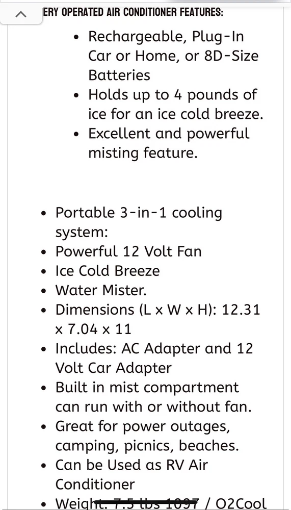 Stay cool all summer long with the O2Cool large portable battery powered air conditioner cool box with misting fan. This portable battery air conditioning fan operates on battery power or an AC home wall adapter (included) . A battery operated air conditioner fan is a must for those long hot summer nights or during those long days when the power goes out for hurricanes or earthquakes. This 12 volt O2Cool battery cool box fan goes anywhere and last for hours on a single set of alkaline batteries. Always plan ahead and stay cool! Great for portable RV air conditioner. This powerful long lasting battery powered fan has more cooling power than any other.