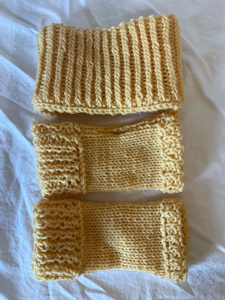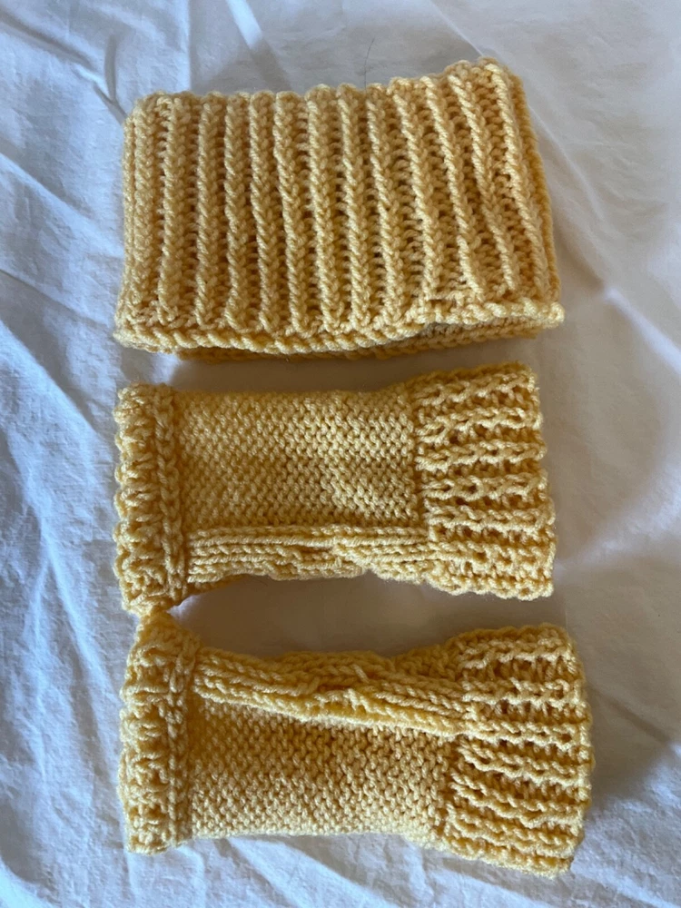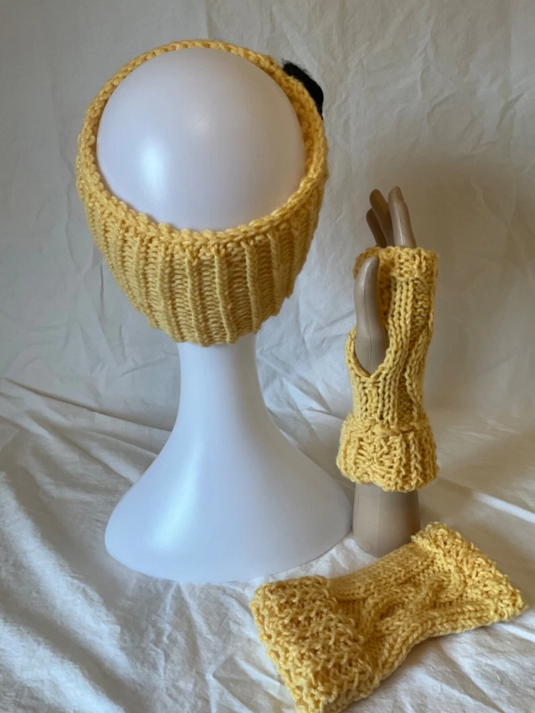 Original Design! OBD Handmade, Hand Knit Buttercup Yellow Snood/headband is too cute, and may also be worn as a cowl. It is fashioned double thick in the round for extra warmth—no seams to irritate skin—of a stretchy rib stitch, and features a red lady bug with black eyes and wing boarders, 4” x 14” circumference—stretches to 26” ONE SIZE FITS MOST. To complete your cozy look, the set ALSO includes a pair of wrist length (7” long, thumbhole placement between 2 1/2” and 3 1/2”) fingerless gloves, fashioned in the same 100% acrylic Buttercup Yellow, featuring double thick (8” circumference—stretches to 10”) cuffs and a cable motif. One size fits most. Manufactured in a smoke free environment. Both interior and exterior construction images shown. EASY CARE: Machine wash (lingerie bag recommended). Tumble dry. Do not bleach. Do not iron. Do not dry clean. Ships free domestic USPS.