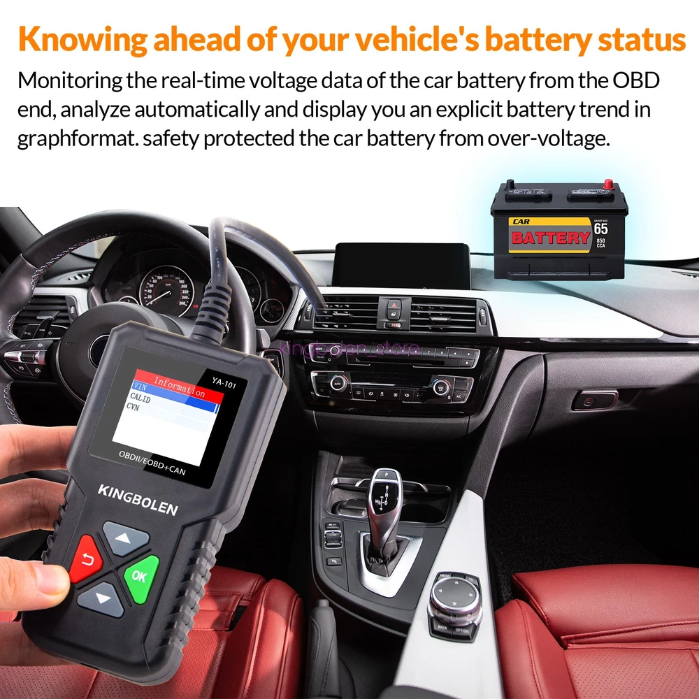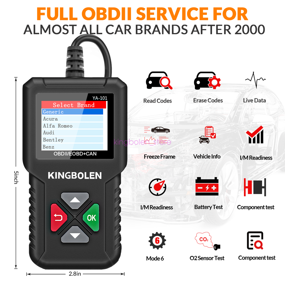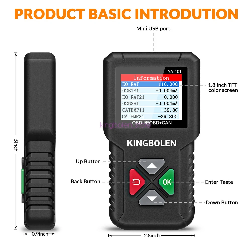 KINGBOLEN YA101 OBD2 Scanner Auto Diagnostic Tools OBDII EOBD Code Reader KW310 For 12V Car DiagnosIs [Key Reasons To Buy YA-101 ] Check Engine Light/Turn off MIL( Malfunction Indicator Light ) Help to Pass Vehicle Safety Inspection and Emissions Inspection Full OBDII Diagnostic Functions Advanced Mode6 On-Board Monitor Test and Mode8 EVAP Test/Compoment Test Battery Test Screenshot Display 9 Languages supported and Extensive Vehicle Coverage Lifetime Free Update (Note: UPDATE IS NOT NECESSARY before utilization. The YA-101 comes with 31.5 inch cable) YA-101 provides full OBDII/EOBD diagnostic functions and meets protocols such as ISO9141-2, ISO14230-4, SAEJ1850, and ISO15765-4. YA-101 is better than CR3001 and CR319.YA101 provides a permanent free upgrade service that can be quickly upgraded and free of drivers. YA101's mode 6 function is precise and perfect, not only can check the fault code, but also can find the cause caused by the fault code, and can carry out battery test.YA101 is your best choice. YA-101 Bullet Points: 【TFT Color Screen】 1.8 inch TFT true color display and high physical button design. 【Screenshot Display 】 Press and hold the up and down button for 3 seconds to quickly take a screenshot 【Full OBDII Diagnostic Functions】 Read & Clear DTCs, I/M Readiness Status, Read Freeze Frame and Data stream, Read Vehicle Information, O2 Sensor Test , On board Monitored systems Test (mode 6) , EVAP Test (mode 8) 【DTC Look Up】 Looks up definitions of DTCs stored in scan tool, and shows the possible causes of the DTC. (NOT every DTC with possible causes reason) 【Battery Testing】 Let you better know your car’s battery status. 【Extensive Vehicle Coverage】 Works on US vehicles from 1996 and newer,EU vehicles from 2000 and newer and Japanese vehicles from 2006 and newer. 【Support Multilanguage】 English,Chinese,France,Deutsch,Italian,Japanese,Espanish,Russian,Portuguese 【Lifetime Free Update】 No need to install drivers can be updated via USB, so you always have the latest car model data. 【Plug&Play】 Not require any battery, get the power directly from the vehicle when connecting vehicle’s DLC socket. 【Easy-to-carry】 Especially made for people who don't want bulky devices,e asily pack and carry it to anywhere. 【Cost-effective】 Within the price range of under $50, this scanner is a no-brainer decision. Featuring full OBD2 functions, easy operation, compact design etc. With a budget friendly price, it’s the best possible solution for any entry-level DIYers to perform basic car maintenance. Advanced Features: Check Engine Light Faster and in-depth scan the engine modules, it helps to find out the hiddened issue of the engine light.Focus on the important modes like read and clear codes, mode6 and mode8, you can easily to know the on-board monitor system and the evap system.You can also see the status of the misfire cylinder. FULL 10 OBDII Modes 1.Reading Codes: Show the detailed description of the Diagnostic Trouble Code (DTCs) 2.Erasing Codes & Reset: Turns off Check Engine Light (MIL), clears codes and resets monitors. 3.Data Stream : Reads and displays live ECU/PCM data stream, plotting functions graphically and stores freeze frame data. 4.I/M Readiness Status : Shows whether the various emissions-related systems on the vehicle are operating properly and are ready for inspection and maintenance testing. 5.Read Live Data Stream: Show the information of continuous data stream from a vehicle in live graphic (waveform) display. 6.View Freeze Frame Data: Check the certain vehicle conditions which are recorded by the on-board computer at the time the emission-related fault occurs. 7.O2 Sensor Test: Allows retrieval and viewing of O2 sensor monitor test results for the most recently performed tests from the vehicle’s on-board computer. 8.On-Board Monitor Test: Retrieves and displays test results for emission-related powertrain components and systems. 9.Read Vehicle Information : Display the information such as VIN (Vehicle Identification Number), CID (Calibration ID) and CVN (Calibration verification number), etc. 10.Component Test: Certain vehicle components can be actuated by commands sent from the scanner to test their operability. Lifetime Free Update No need to install drivers. Download the application of the YA101 on PC and copy it to the YA101 via the USB cable. Review Back functions Help you record and play back a readout or graph. This is useful if you have an intermittent problem that doesn’t generate a code. Quick Operations and Diagnosis YA-101 OBDII scanner has a fast and intuitive operation through an easy-to-use and quick diagnostic response than comparable products. Support Car Models for OBDII diagnostic function: ( Note: YA-101 only Support 12V cars, Does not support 24V Truck ) YA-101 Support all legislated OBD2 protocols car : 1.SAE J1850 PWM(41.6Kbaud) 2.SAE J1850 VPW(10.4Kbaud) 3.ISO9141-2(5 baud init,10.4Kbaud) 4.ISO14230-4 KWP(5 baud init,10.4 Kbaud) 5.ISO14230-4 KWP(fast init,10.4 Kbaud) 6.ISO15765-4 CAN(11bit ID,500 Kbaud) 7.ISO15765-4 CAN(29bit ID,500 Kbaud) 8.ISO15765-4 CAN(11bit ID,250 Kbaud) 9.ISO15765-4 CAN(29bit ID,250 Kbaud) American Car : For Chrysler , for Ford, for GM, For Jeep ... Need Standard OBD2 Protocols from 1996 to now European Car : For Alfa romeo , for SAAB ,for Acura , for Opel , for Audi for Seat , for Peugeot , for Renault , For Bentley , for Skoda , for Daewoo , for Benz , for Daihatsu , for Land Rover , for BMW , for Vauxhall , for Citroen , for Volvo , for Fiat , for VW , for Ford , for Jaguar... Need Standard OBD2 Protocols from 2000 to now Japanese/Korean Car: For KIA, for Isuzu, for Honda , for Mitsubishi, for Hyundai , for Dacia , for Lexus , for Mazda, for Nissan, for Subaru , for Suzuki, for Toyota...Need Standard OBD2 Protocols from 2006 to now Chinese Car: Need Standard OBD2 Protocols from 2008 to n ow NOTE: Even though it is compatible with most cars, but different regions support t
