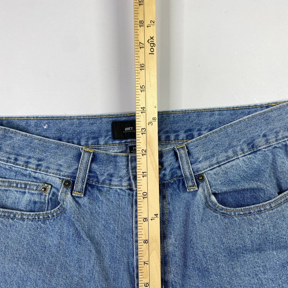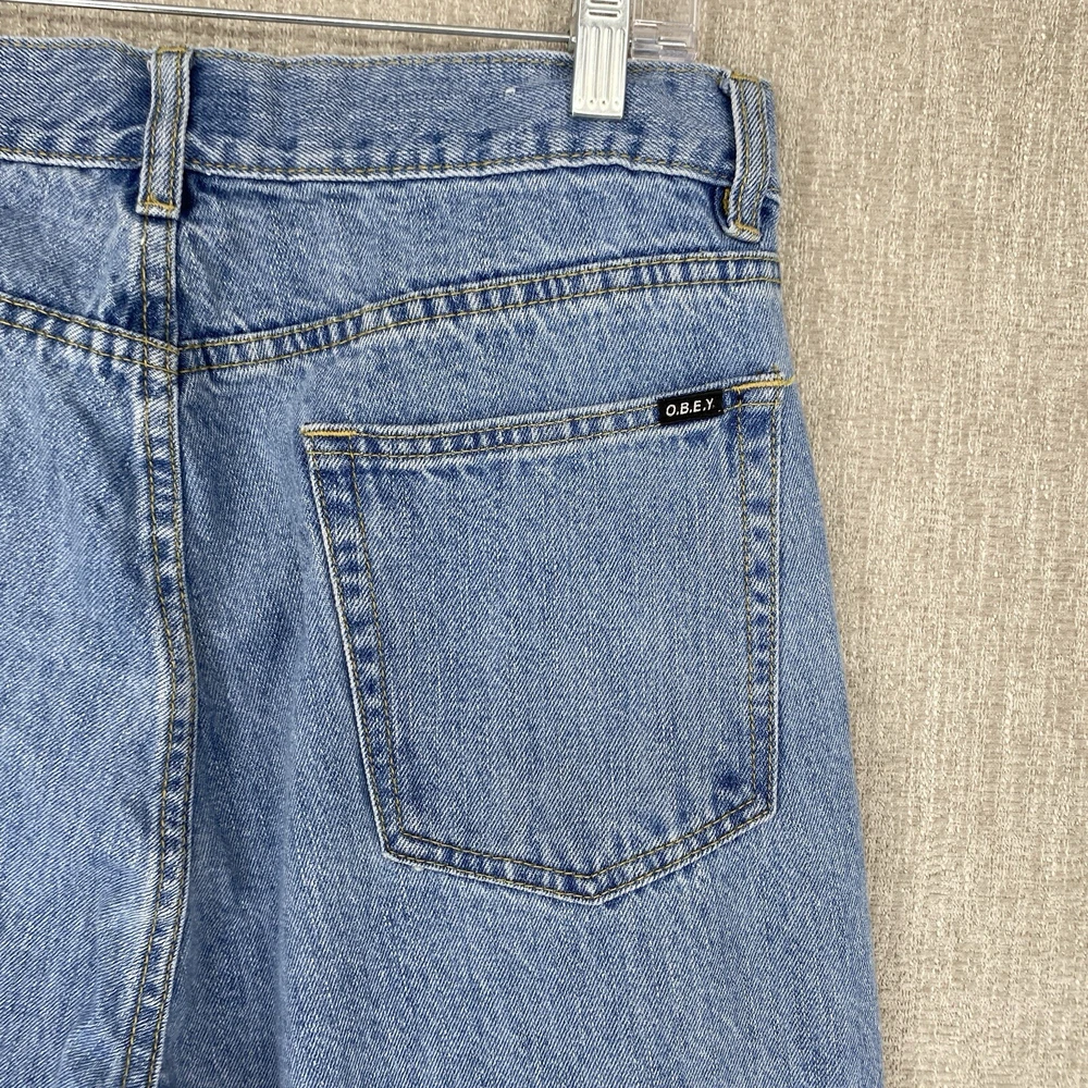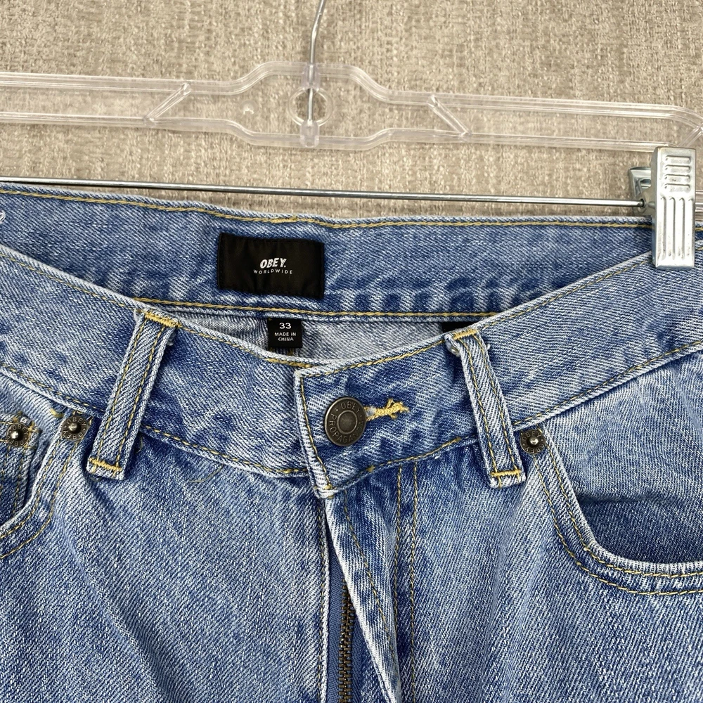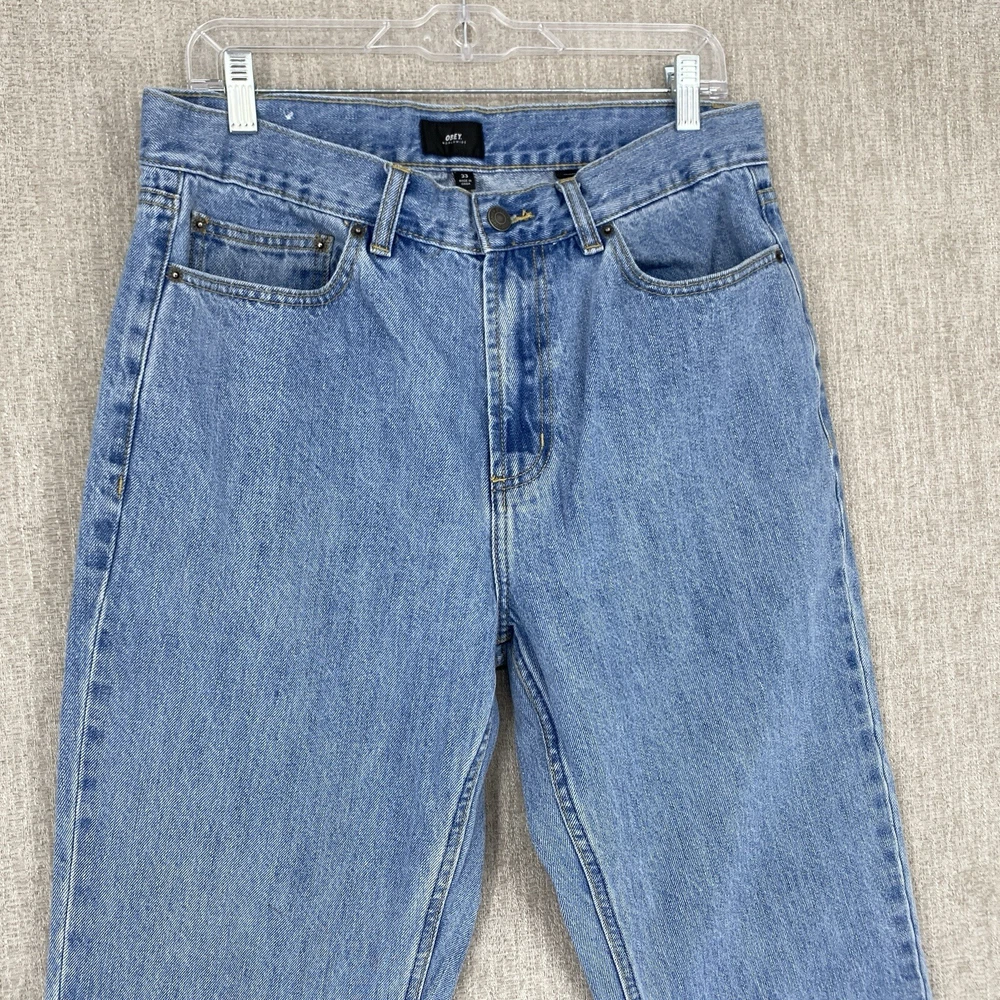 Pocket Type: 5-Pocket Design Fit: Regular Material: Cotton Fabric Type: Denim Vintage: No Size Type: Regular Type: Jeans Accents: Logo Waist Size: 32 in Pattern: Solid Season: Fall, Spring, Summer, Winter Fabric Wash: Light Style: Tapered Theme: 90s, Retro, Carpenter, Streetwear, Skate Features: Comfort, Pockets Color: Blue Rise: Mid (10-12 in) Brand: OBEY Garment Care: Machine Washable Closure: Button, Zip Size: 33 Department: Men Inseam: 25 in