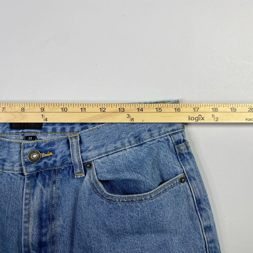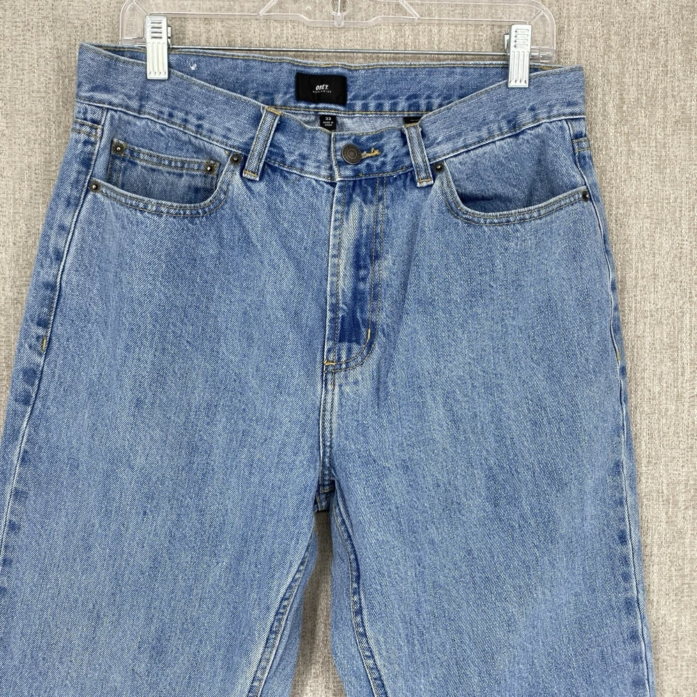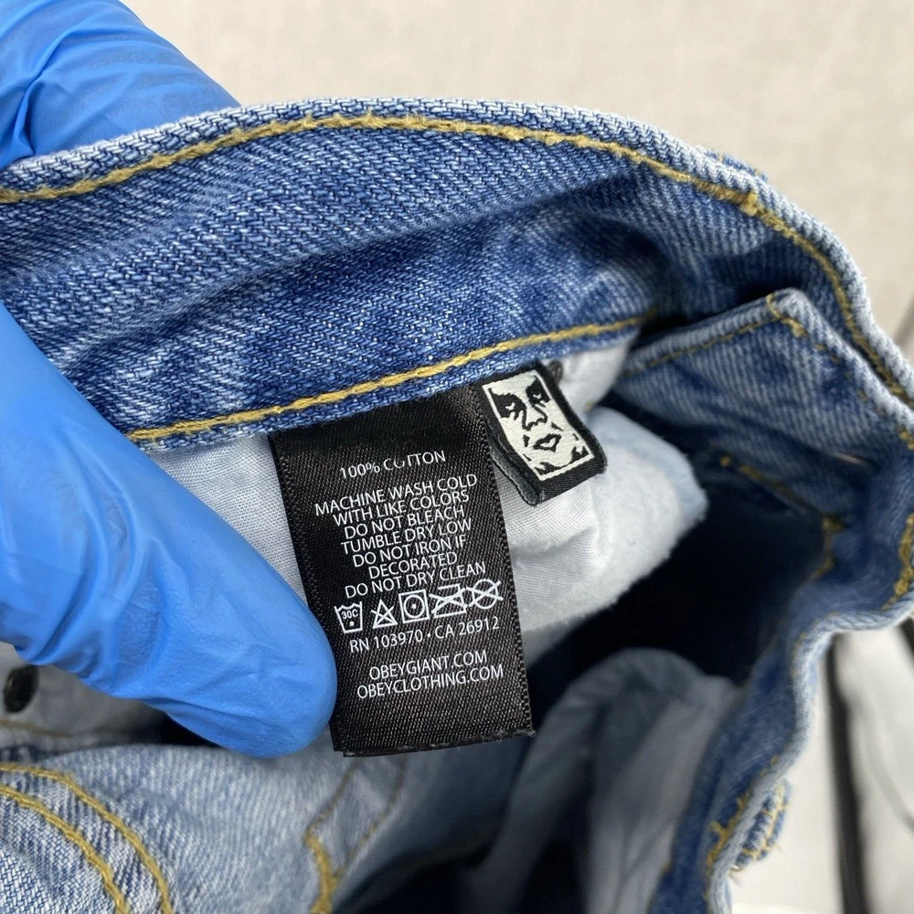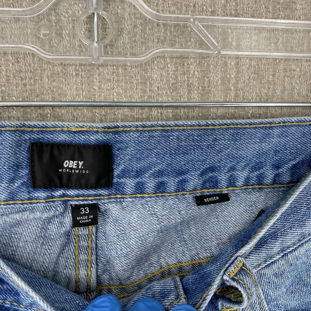 Pocket Type: 5-Pocket Design Fit: Regular Material: Cotton Fabric Type: Denim Vintage: No Size Type: Regular Type: Jeans Accents: Logo Waist Size: 32 in Pattern: Solid Season: Fall, Spring, Summer, Winter Fabric Wash: Light Style: Tapered Theme: 90s, Retro, Carpenter, Streetwear, Skate Features: Comfort, Pockets Color: Blue Rise: Mid (10-12 in) Brand: OBEY Garment Care: Machine Washable Closure: Button, Zip Size: 33 Department: Men Inseam: 25 in