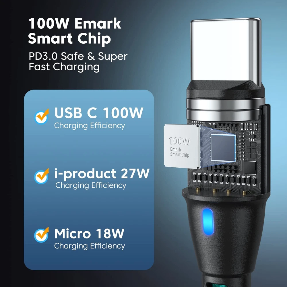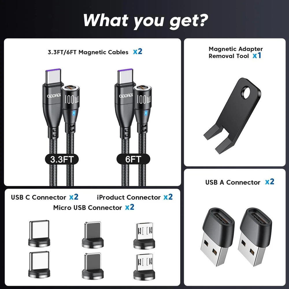 ODDADD 100W USB C Magnetic Charging Cable 2pack(3.3ft+6ft), 6 in 1 Magnetic Fast Charging Cable, Magnetic USB C Charging Cable Compatible with Micro USB, Type C and All Devices 100W Magnetic USB Cable, PD Fast Charging & Data Sync CableFeatures:3.3ft+6ft length charging cable can meet all your living and working needs at any time like home, office using or car driving. USB2.0 data transfer supported QC3.0&PD quick charge support, fast charging time saving! Bending 10000+ times lifespan and Extra Durability Blue LED light design helps you to find it easily at night. Detailed Output Parameters:USB-A to Type-C (18W)USB-A to Micro (15W)Type-C to Type-C (100W)Type-C to Micro (15W)Compatible With: USB C for LG G5/G6, Nexus 5X/6P, Samsung Galaxy S10/S9/S8, HUAWEI Mate20/P20, Pixel,Chromebook Pixel, Dell XPS 13, Razer Blade Stealth, ZenBook 3,HP Spectre notebook, Envy 13t, and More Type C Devices. Android Phones from other Manufacturers like Motorola, Huawei, Google, Blackberry, LG & HTC Most Android Tablets like the Samsung Tabs or Power Banks or Bluetooth Speakers Headphone and Any other device that charges through a micro usb cable.What is in the package: 6ft magnetic charging cable * 1 3.3ft magnetic charging cable * 1 Micro adapter* 2 Type-c adapter*2 Other adapter*2 Magnetic adapter removal*1 ⚡【100W Super Fast Charging】Experience unprecedented charging speed with the ODDADD magnetic charging cable. With its super-fast 100W PD tech, it is 3X faster than the previous 60W USB C cable. It recharge your devices up to 80% in 30 minutes. And provides data transfer speeds up to 480Mbps, it is 20x faster than most WiFi, perfect for CarPlay & Android Auto for music streaming, listening to podcasts, and powering up your GPS navigation system. ⚡【Exclusive Emark Smart Chip】Your safety is our first priority. With its exclusive Emark smart chip, this magnetic usb c charging cable can intelligently identifies the charging device and its charging power to adjust the optimal voltage and current for the fastest charging power without overloading. Additionally, the cable has a trickle mode feature that activates when the battery is fully charged, protecting its life and eliminating the need to worry about charging overnight. ⚡【Strong Magnetic Connector】 Featuring a strong magnetic connector with a 9-pin design, this usb c magnetic charging cable is more magnetic than the old-generation 1-pin and 5-pin connectors, making it not easy to drop. If you need extra tips for this magnetic charging cable, please choose the 9 Pin tips in the ODDADD store. Our 9 pin magnetic tips is compatible with all 9 pin magnetic charging cable on the market. ⚡【360° Rotation & LED Light Design】The magnetic phone charger head can rotate 360°, making it easy to connect with one hand while driving or doing other things. The LED light is designed to help you find your phone more easily in the dark. This magnetic charging cable is the best choice for drivers, vision-impaired individuals, children, seniors, and handicapped persons. ⚡【What's in the Box?】 2 × magnetic charging cord ( 3.3+6ft), 2 × magnetic Micro USB tips, 2 × magnetic Type-C tips, 2 magnetic iProduct tips, 1× USB A head, 1×manual . Each magnetic charging cable is manually tested to ensure that it works perfectly. If you have any quality or compatibility questions, please contact us first. Please note that the ODDADD 9 PIN magnetic cable is only compatible with 9 PIN magnetic tips. Shipping from the USA All of our products are shipped from the USA, ensuring quick delivery to your destination. Payment We offer the following payment methods: PayPal, credit card, bank transfer, and eBay's secure payment system. Free Shipping & Free Returns Shipping within the USA is FREE. Additionally, any return is absolutely free for you. Risk-Free Purchase You have the option to return an item within 30 days without any justification. We cover the return shipping costs! Fast Shipping We ship immediately upon receipt of payment. Generally, the package is delivered within 2-3 days in the USA. If it takes longer, we will contact you. Quality and Costs Made in Europe, USA, China No customs fees or additional charges Total satisfaction guarantee Invoice with declared VAT available upon request in .pdf format Feedback Your feedback is very important to us. After you pay for your purchase, you will automatically receive positive feedback from us.