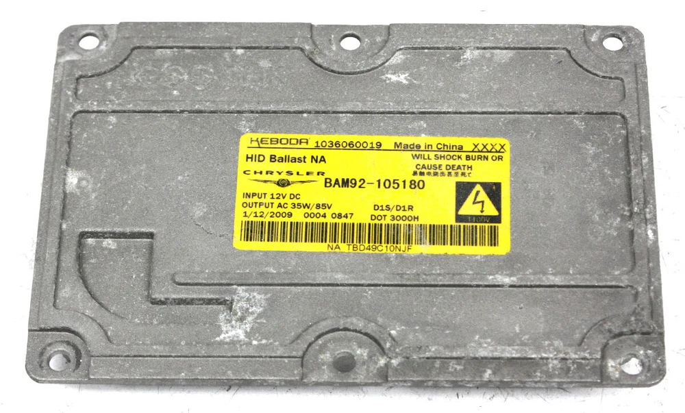 Alpha Automotive STORE OEM Right Passenger Side D1S or D1R HID ballast For Chrysler 300 BAM92-105180 Specifications Payment Returns MSRP: $324.00 Brand: Chrysler Condition: Used Notes: FITMENT NOTES: High Intensity Discharge (HID) Xenon lighting control module ballast. ONLY for models with D1S or D1R bulb type Lens surface may have marks. Genuine OEM part. Part is in good condition. Please verify part the number with your local Chrysler dealer using your VIN and the part number provided before purchasing. Manufacturer Part Number: BAM92-105180 Interchange Part Number: 114-01321R Placement on Vehicle: Front*Right Part Brand: Chrysler Inventory ID: 44551 Amazon orientation: passengers_side Other Part Number: 68060470AA Warranty: 90 Day amznshippingtemplate: US_Standard_Template publishtochannels: yes We accept PayPal, American Express, Discover Card, Visa or Master Card. Buyers agree to pay at the time the order is placed. Prices for Products exclude all insurance, freight, federal, state and local taxes, fees, and other governmental assessments, all of which shall be paid by Buyer directly. Your satisfaction is important so returns are accepted for non-electrical products for 30 days. All returns require prior authorization by contacting Customer Service. At our sole discretion, we may accept returns for exchange or refund. Items must be in same condition as shipped. If an item is received damaged or incorrectly product, please contact Customer Service immediately. Items that are defective and shipped from us or items that you did not order but received from us, will qualify for a refund. Refunds are contingent upon inspection of item(s) once we receive the returned product. There is a 20% restocking fee for all returned items that are not being exchanged and are not damaged. Again you MUST contact us within 30 days if you intend to return ANY item sent from our store. The Customer is responsible for all shipping costs if seller is not at fault. Notes: FITMENT NOTES: High Intensity Discharge (HID) Xenon lighting control module ballast. ONLY for models with D1S or D1R bulb type Lens surface may have marks. Genuine OEM part. Part is in good condition. Please verify part the number with your local Chrysler dealer using your VIN and the part number provided before purchasing. Additional Description and Condition Notes: OEM For Chrysler 300 Right Passenger Side D1S or D1R HID ballast Placement: Right Hand, RH, Passenger Side. Part Numbers: BAM92-105180; 68060470AA Genuine Chrysler Part Important Fitment Note: - High Intensity Discharge (HID) Xenon lighting control module ballast. - ONLY for models with D1S or D1R bulb type Fits: 2009-2010 Chrysler 300 This may fit other Vehicles, Years, and Models. While every reasonable effort is made to ensure the accuracy of the information for this listing, the buyer is responsible to research proper vehicle fitment before purchasing.