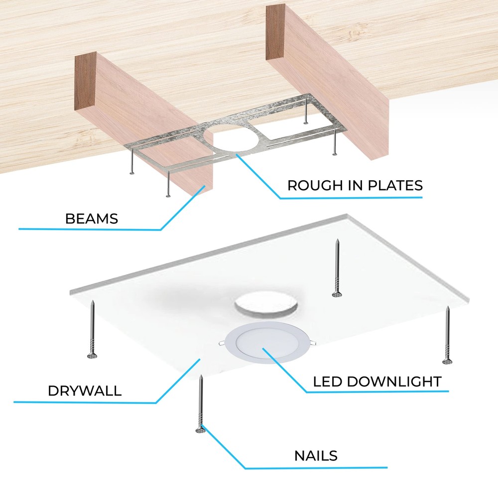 RECESSED PLATE SET: Made from top quality galvanised steel material, our led light mounting plate ensures that they are durable through wear and tear. The slots allocated on the plate come with alignment notches in a way to allow easy mounting of the LED light wherever you want. SUITABLE FOR NEW CONSTRUCTION: These plates are the perfect accessory to have whenever you are installing lights in a newly constructed building! The rough in plate light mount comes in a variety of choices for the recessed holes from 2 inches to 8 inches which you can choose depending on the lighting need. MODERN FEATURES: The galvanised steel used in the making of the plates make it lightweight and less likely for rust formation. Use these plates for planning your lighting layout prior to hanging drywall, they will hold the precise spot in the ceiling where the light fixture will be mounted. EASY INSTALLATION: The recessed light plate has mounting holes and tracks that make our mounting plate perfectly fit in different types of structure layouts. Alignment notches on the plate will help align multiple plates. Fix the plates with screws(not included) through the mounting slots. VERSATILE APPLICATIONS: They are ideal for all types of construction projects from residential to commercial buildings. The flat panel light mount comes with a wide range of available designs for types of the LED lights from the small lighting fixtures to commercial decorative lights.