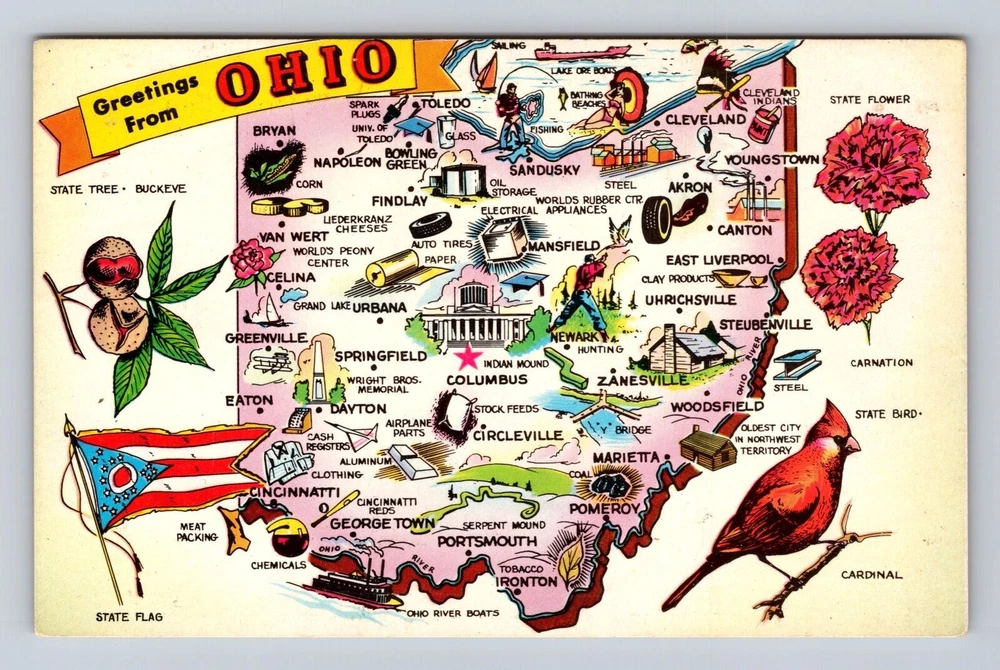 OH-Ohio, General Map Landmark Greetings, Antique, Vintage Souvenir Postcard