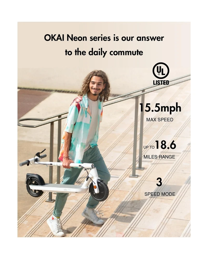 OKAI Neon Electric Kick Scooter - ES10/20/30 Models - 18.6-50 Miles Range & 15.5-20 MPH, Dual Brakes - Commuter Electric Scooter for Adults & Teens, UL2272 Certified Description Features: Introducing the NEON Lite: The perfect entry-level personal electric scooter for medium-distance commuting. It can reach 15.5 mph and travel up to 18.6 miles on a single charge. Its three speed modes offer versatility for any situation. Thanks to its 600W peak power motor, the NEON Lite can conquer hills with ease, making it a reliable and convenient mode of transportation for any commuter. Built to Last: To enhance the lifespan of electric scooters, we maintain high standards that guarantee both comfort and durability. Crafted from aircraft-grade aluminum, the frame is meticulously designed. Looking for a durable electric scooter for yourself? This is the place to start. Practical Yet Aesthetic: Different from the traditional style of electric scooters, Neon series is futuristic. It feels like the scooter has been carved from a single piece of metal, featuring elegant curves, clean lines. And it has an Ultra-Modern and Ultra-Clean Cockpit. High-resolution LCD display to keep you informed about the ride. Superior Safety: This adult electric scooter is equipped with 9" tubeless tires that help prevent flats and punctures, ensuring you can stay on the road without any unexpected interruptions. You can rely on excellent braking power with disc and electronic brakes, giving you peace of mind and complete control. APP Support: Connect your scooter to OKAI app and unlock a world of customization. Customize the ambient lights and dashboard interface to your liking, and personalize your ride mode for the ultimate experience. Features such as NFC and Bluetooth, smart detection and cruise control can be easily controlled in the app. We Take Care of Everything: Contact us if you are not satisfied with our product, you will receive 100% local customer support and quality assurance. If there are any quality problems, we promise to replace or refund you. Product Details: Brand: OKAI Color: White Age Range (Description): Adult Special Feature: Dual Braking System, Cruise Control, Wide Platform, Lockable, Foldable Weight Limit: 220 Pounds Product Dimensions: 44.9"L x 17.7"W x 42.7"H Number of Wheels: 2 Model Name: ES10 Wheel Material: Rubber Frame Material: Aluminum Brand: OKAI Color: White Age Range (Description): Adult Special Feature: Dual Braking System, Cruise Control, Wide Platform, Lockable, Foldable Weight Limit: 220 Pounds Product Dimensions: 44.9"L x 17.7"W x 42.7"H Number of Wheels: 2 Model Name: ES10 Wheel Material: Rubber Frame Material: Aluminum Item Weight: 33 Pounds Handlebar Type: Fixed Wheel Size: 9 Inches Wheel Type: Neon Lite: Tubeless Neon: Solid + Pneumatic Suspension Type: Rear Suspension Grip Type: Ergonomic Brake Style: Front:electric brake, Rea: disc brake Warranty Type: Limited Charging Time: 4.5 Hours Recommended Uses For Product: Urban commuting, short-distance travel Maximum Distance Range: 18.6 Miles Manufacturer: Zhejiang Okai Vehicle Co., Ltd. UPC: 810100340209 Item Package Dimensions L x W x H: 43.12 x 18.37 x 8.25 inches Package Weight: 18.58 Kilograms Item Dimensions LxWxH: 42.7 x 44.9 x 17.7 inches Brand Name: OKAI Warranty Description: Limited Warranty Material: Aluminum Suggested Users: unisex-adult Part Number: ES10 Style: ES10 Included Components: Electric Scooter Date First Available: February 27, 2023 Delivery We Do Not Ship Outside of the Continental US. Return Policy All items qualify for returns within 30 days of receipt. Buyer is responsible for return shipping on any item that is not damaged. Feedback We take our reputation seriously, we buy and sell online, so we understand the value of trust. If you are unsatisfied with your order, please contact us and we will work with you to resolve it to your satisfaction.