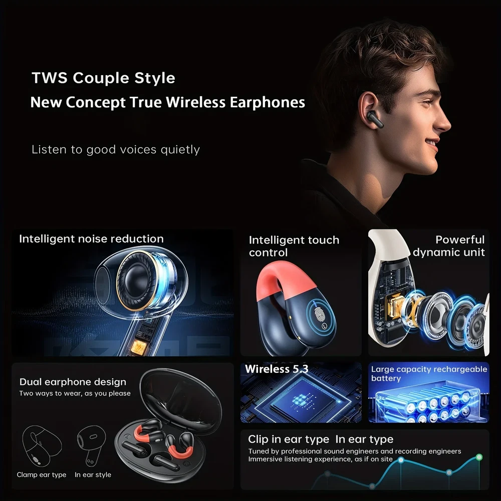 These wireless earbuds are a game-changer! The sound quality is crisp and clear, with deep bass that makes music and calls enjoyable. The 2-in-1 design is super convenient—perfect for workouts or casual use. Battery life is impressive, and the snug fit ensures they stay put during intense activities. The smart noise feature works well, blocking out distractions without sacrificing audio quality. Definitely worth the buy!