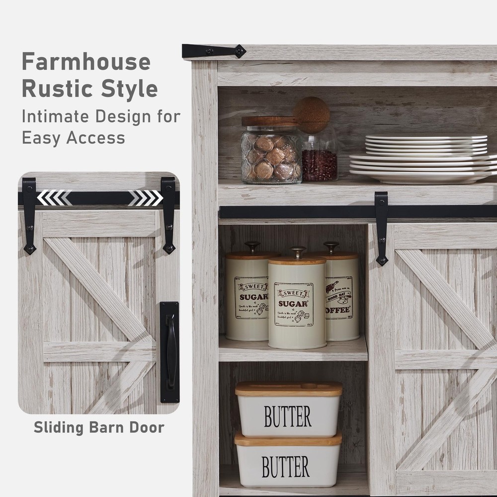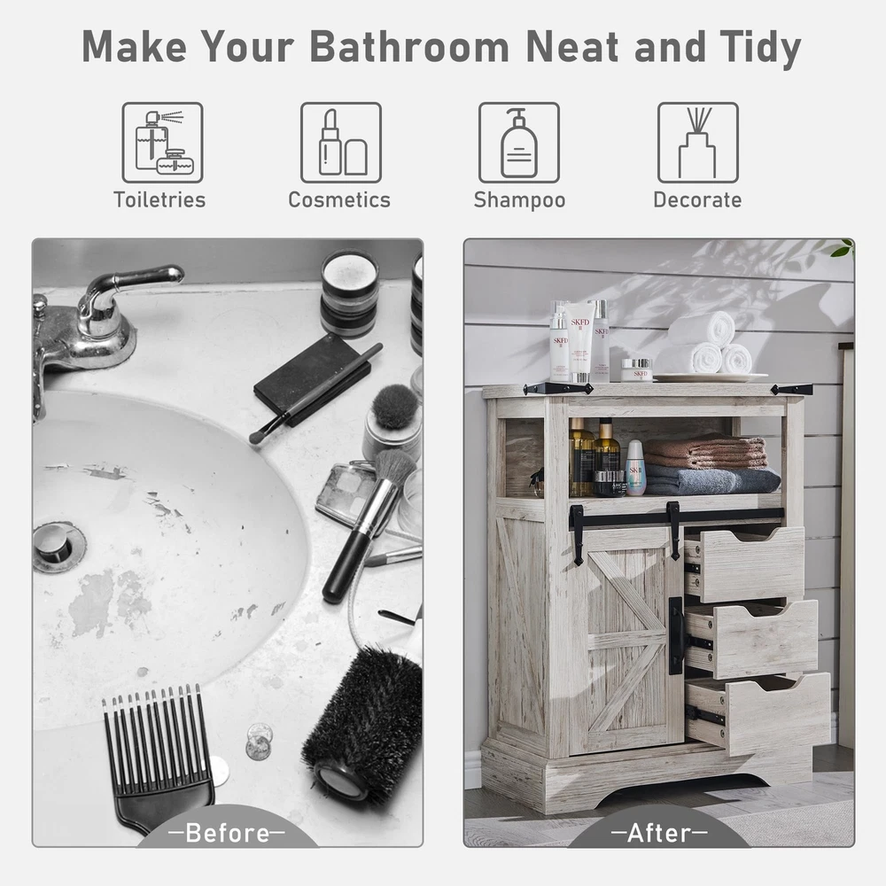 [CUSTOMIZED STORAGE SPACE] 23.5"L × 12"W × 32"H, Utilize the tabletop to store cleaning supplies of any height, open shelf and three storage drawers for small items. Also sliding barn door and adjustable shelf to suit your storage needs, creating an orderly life space without mess not only in bathroom [FARMHOUSE RUSTIC STYLE] Crafted from high-quality engineered wood, our storage cabinet is designed with classic barn door, double cross pattern and weathered finish that gives a charming rustic feel. Redecorate the whole space with elegant metal decorations to add more deeper farmhouse touch for it [STURDY SUPPORT] Comes with one sturdy support base and tipping restraint hardware, so you could fix this small cabinet to the wall and prevent it from wobbling or tipping over. Also, please make sure hardware is suitable for your walls before installing, as different wall materials may require different types of anchors [WATERPROOF MATERIAL] Waterproof surface and anti-rust coated metal accent hinges are ready to be used in moisture environments and easy to clean dust off, which makes it really suitable for using in bathroom and guarantees a long-term use even around some humidity [EASY ASSEMBLY] Step-by-step instruction and hardware pack are in one package with the item, every part has an own label for easy assembly and there is no need of any power tools. We are always ready at your service if you have any issues with our product before or after your purchase
