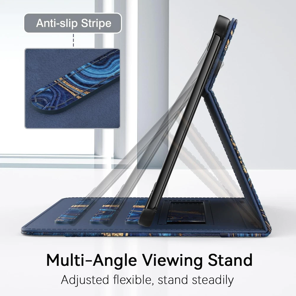OKP forTablet 11 Case (13th Generation, 2023 Dark Blue Marble Product Details Package Dimensions: 10.59 x 6.77 x 1.02 inches Item Weight: 10.2 ounces Special features: Adjustable Stand Anti slip Auto Sleep/Wake Magnetic Closure Card Slots Scratch Resistant Form Factor: Case Color: Dark Blue Marble Manufacturer: OKP Brand: OKP Compatible Devices: Tablets Shell Type: Hybrid 【Full Protection】:The tablet case is made of high quality PU leather exterior + soft microfiber lining + hard PC back shell. Touching comfortable and providing comprehensive protection for 11 tablet, effectively preventing scratches, shocks, drops and impacts. 【Built-in wrist strap】 :The case with built-in wrist strap so you don't worry about your Kindle 11 tablet falling when reading. The interior hand strap gives you a comfortable single-handed use experience. Enjoy your reading time. 【Multiple Angles】 - Provides three angles for your tablet 11 to meet your viewing and typing needs, freeing your hands for other entertainment activities. 【Auto Wake/Sleep】 - Built-in magnetic strip, secures the case closure, easy to snap on and off. It auto wakes or sleep when you open/close it. Protects and extends battery life.
