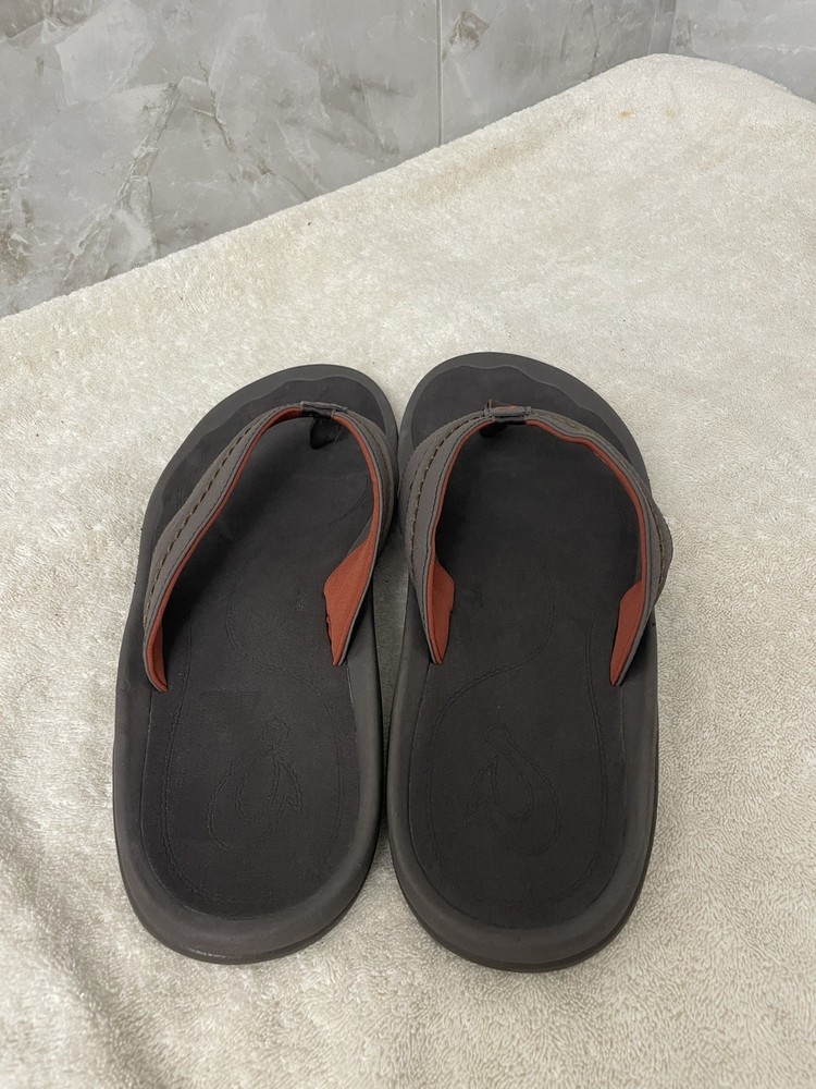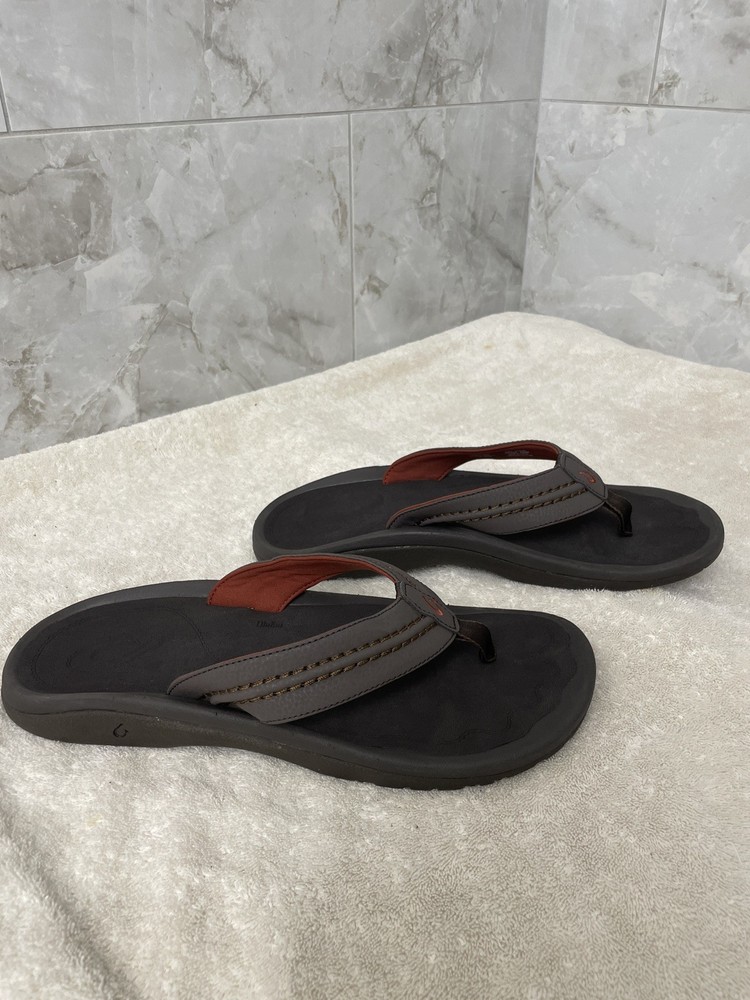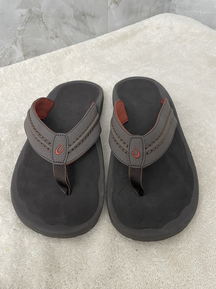 The OLUKAI "HOKUA" Dark Java Brown Leather Flip Flop Sandals for men in size 13 are a stylish and comfortable choice for warm weather. Made with high-quality leather, these sandals feature a classic flip flop style with a durable outsole. The rich brown color and sleek design make them versatile for various casual outfits. Perfect for outdoor activities or everyday wear, these sandals are a must-have for any man's shoe collection. New without tags