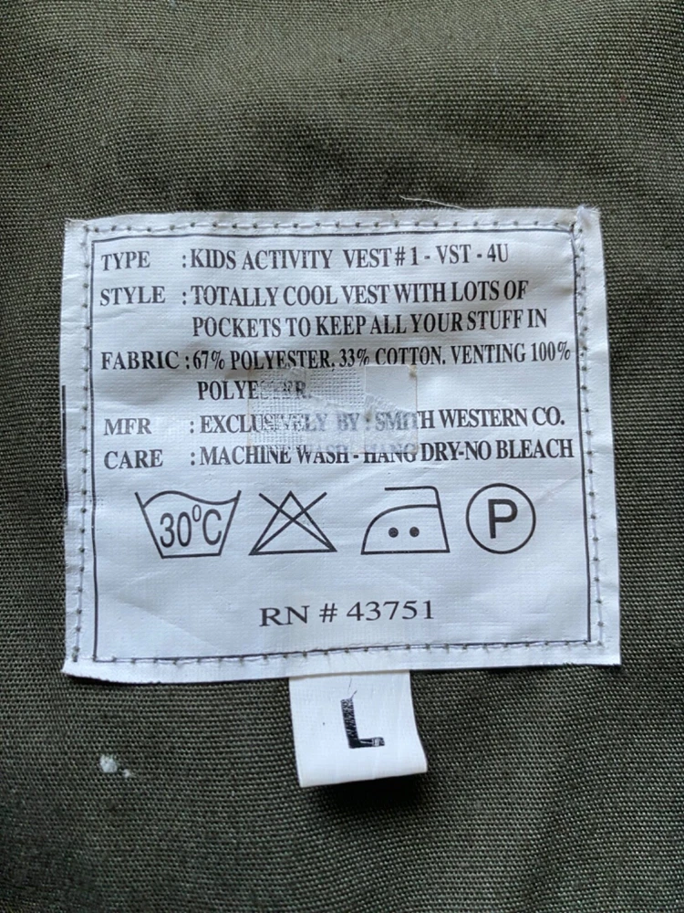 SMITH WESTERN CO. Sleeveless Dark Green Kid's Park Ranger Vest~Kid's Size LARGE Kid's SMITH WESTERN CO. activity vest *Size: LARGE *Fabric: 67% polyester/33% cotton *Color: Dark muted green *Zipper down center front *Chest: 16 inches from armpit to armpit laying flat *Length: 16 inches from top center back to the hem *Condition: great, pre-worn condition with no stains, rips or tears *We have a smoke-free home.