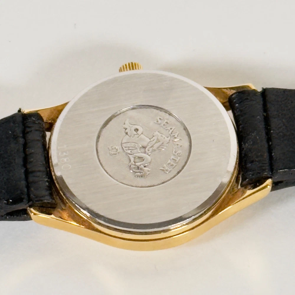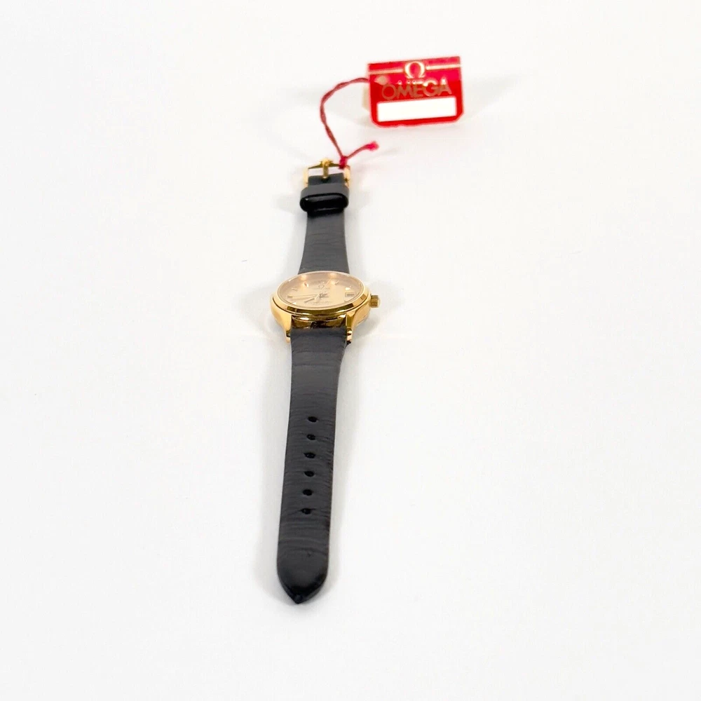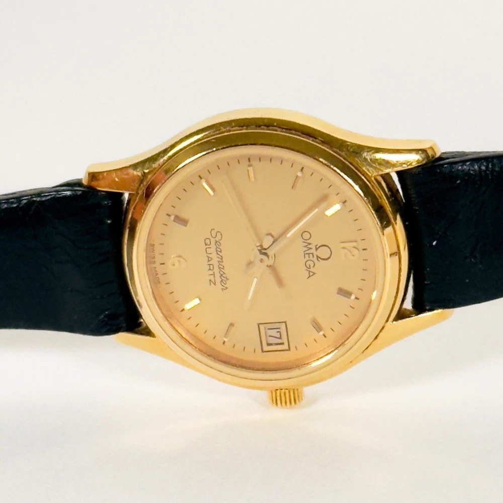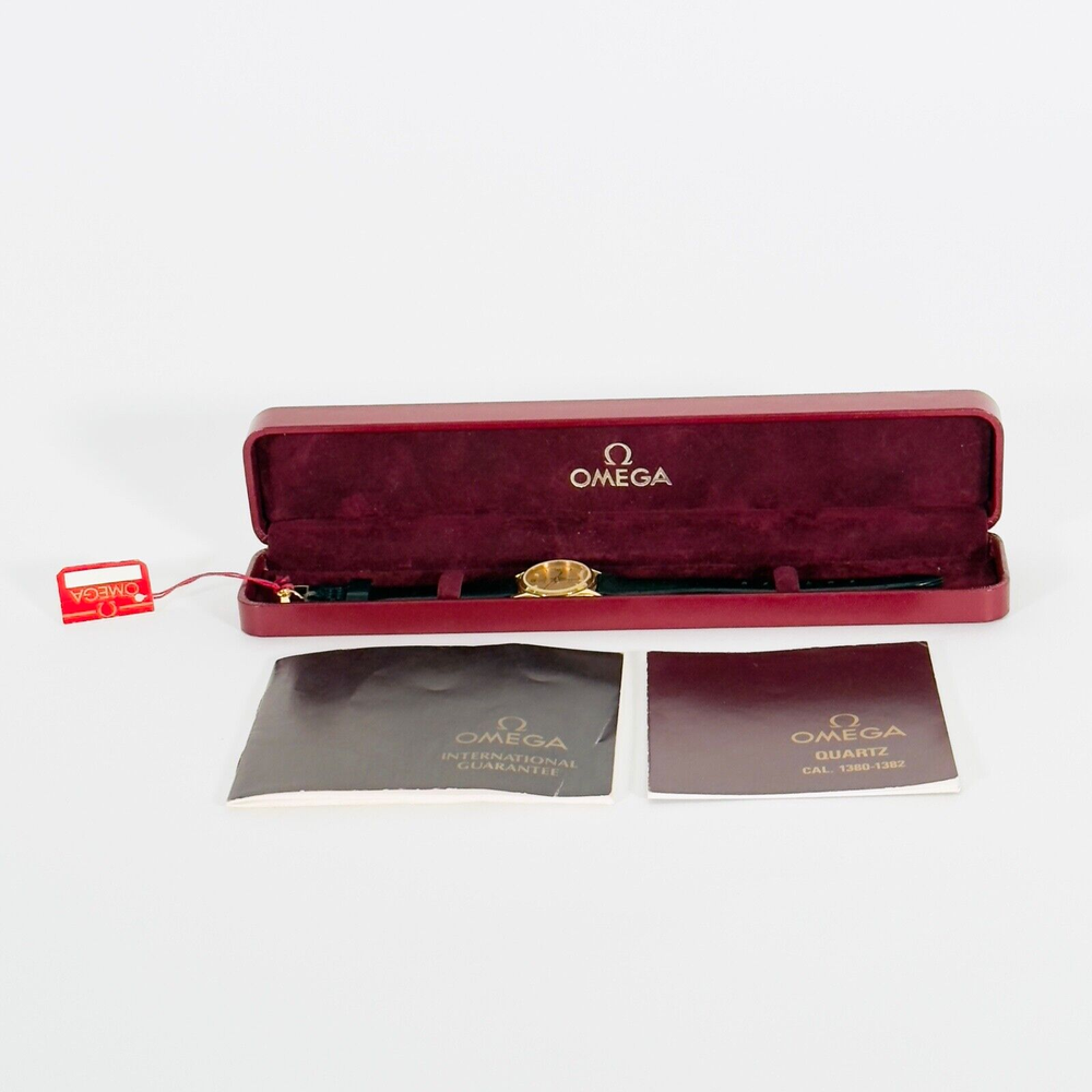 OMEGA Seamaster 596.0044 "BREST" | 18K GP Ladies Watch | Champagne Gold Dial | 1983 | SET Brand: Omega Model: Seamaster “BREST” Reference: 596.0044 Movement: Quartz Caliber: 1380 Jewels: 7 Dial: Champagne Gold Case Diameter: 23mm (excluding crown) Crown: Omega 18K Yellow Gold-Plated, Signed (Ω Logo) Strap: Omega Black Leather Strap, Swiss Made, 12mm/10mm Buckle: Omega 18K Yellow Gold-Plated Tang Buckle, 10mm ( Marked AW Logo, Swiss, Plaque G Hallmarks ) Year: Circa 1983 Serial Number: 45**46 Accessories Include: – Omega Burgundy Presentation Box – Omega 1380 Movement Manual – Omega International Guarantee (1983) – Omega Hanging Tag Condition: Excellent working condition, showing signs of wear consistent with its 42-year age. Dial and case remain well-preserved, and the watch retains its classic vintage charm. This complete set is ideal for collectors seeking an elegant 1980s Omega ladies’ piece with original documentation and packaging. Please review all photos carefully as they are part of the description. We respond promptly to all inquiries. If you have any questions, don’t hesitate to reach out. If anything is less than perfect, please contact us before leaving feedback. We’re here to help. Thank you for choosing ION Watches. We sincerely appreciate your business.