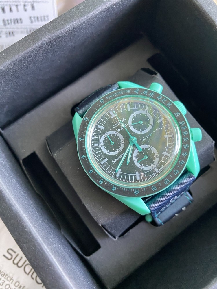 Crafted for both style and function, the OMEGA x Swatch MoonSwatch Mission On Earth, Polar Lights Edition is a sleek timepiece for the discerning individual. The watch features a durable ceramic case with a complementary black dial adorned with baton indexes for a classic yet modern look. Its quartz movement ensures precise timekeeping, while the integrated lights offer a subtle glow for visibility in the dark. The piece boasts a unisex design, making it a versatile addition to any wardrobe. Water-resistant up to 30 metres, it's suited for everyday wear and casual aquatic activities. The watch comes complete with its original box and papers, affirming its authenticity and OMEGA's commitment to quality.