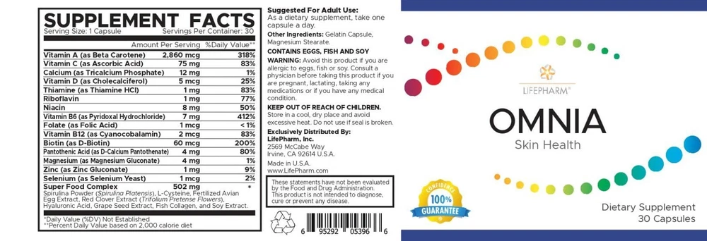OMNIA contains essential vitamins, minerals, and special nutrients for healthy and glowing skin, all in one capsule. It's comprised of three main ingredients proven to continuously rejuvenate the health of your skin as you age: egg bioactive growth factors, the superfood Spirulina, and the herbal extract of Red Clover Blossoms. In addition, it contains three powerful ingredient complexes made up of minerals, collagen, and natural moisturizers to help improve the structure, function, and appearance of skin tissue: Rejuvenation Complex, Super Vitamin B Complex, and Antioxidant and Botanical Blend. This comprehensive and effective formula supports healthy skin and strengthens and improves the appearance of your hair and nails.