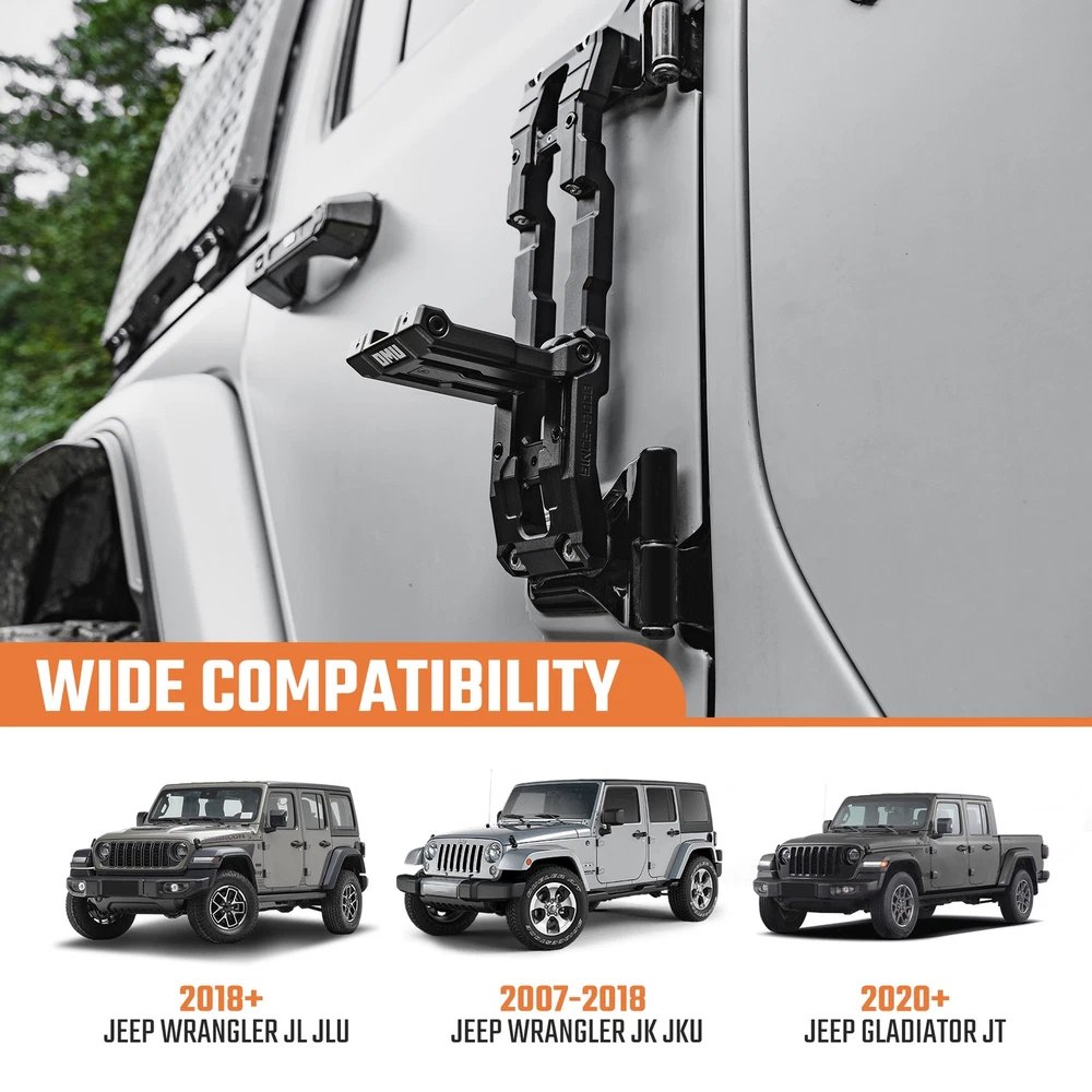 Home Shipping Return Policy About Us Contact Us Feedback Material: Aluminum Alloy Size: Standard, Details Please Check Photos Unit: 1 Set (Hardwares and Installation Instructions are Included) Fit for Jeep Wrangler 2007-2018 JK/JKU, 2018-2026 JL/JLU Fit for Jeep Gladiator JT 2020-2026 Features: Fit: This door hinge rung is compatible with Jeep Wrangler 2007-2018 JK/JKU, 2018-2024 JL/JLU and 2020-2025 Gladiator JT. Quality material: this door hinge rung is made of high-quality aluminum alloy material. Antioxidant, abrasion resistant and rust resistant,CNC Precision machining Function: Helps you put things on the car roof or take them off like a mini ladder. It can be folded after use and has a high load capacity. Foldable pedal design: our door hinge rung with folding design does not affect the opening of the door. Simply fold it up when you don't need it. Easy installation: no drilling, cutting or welding required. Bolt on installation, uses factory hinge mounting points, won't scratch or damage your doors. The perfect addition to your equipment and a help when you need to reach things from high up on your car. Payment Delivery details Terms of sales About us Contact us Payment Thank you for buying, and any payment Ebay accept is OK. Delivery details Usually your parcel or parcels will be handled and sent out in 1 working day. Usually you will receive your parcel or parcels in 2~5 working days, depends on the courier and parcel size, sometimes large parcel is slower. In case there is any problem about tracking or delivery, please feel free to contact us, we will contact courier to resolve, and no matter what, we will resolve for you. Terms of sales Any message from you will be replied in 24 Hours. Any problem will be resolved or offered solutions in 24 Hours. Please kindly do not open any case before contacting us, I promise you that any question or problem will be replied or resolved much faster if you contact us directly. We are all nice and honest people, in case anyone don't reply you in polite manner, or anyone don't resolve your problem in good way, send a message with a title Your manager, then I will take care your problem by myself. Thank you very much, and I am the company owner, Jess Wang. About us A experienced team to service USA people and market, we always be available to our customers, we don't let anyone wait longer than 24 Hours, please feel free to contact us at any time. Contact us Free Return for any problem even it is just a slight problem when you want to return. Please kindly contact us before opening any case. When you want to return just because you buy wrong or just don't like it or just don't want it, also, just contact us, we will assist you as always. Have a lovely day, thank you for visiting.
