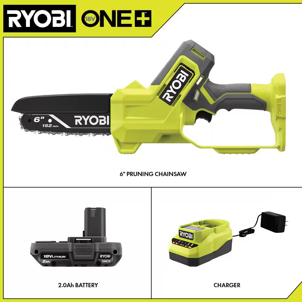 Fast Shipping On All Items 30 Days Money Guarantee Customer Support Excellent Service 100% Satisfaction Satisfaction Guaranteed ONE+ 18V 6 In. Cordless Battery Compact Pruning Mini Chainsaw with 2.0 Ah Battery and Charger Specification Battery Amp Hours 2 Ah Battery Power Type Lithium Ion Battery Size 18-volt Battery Voltage (V) 18V Battery/Charger (1) 2 Ah Battery & Charger Included Chain Pitch 3/8 in. Chain Speed (mps) 4.9 Chainsaw Bar Size Mini Chainsaw Type Hand Chainsaw Charger Included Charger Included Color Family Green Condition New Drive Links 38 Features Portable Filter Type No Filter Gauge .043 Handle Type Rear Handle Chainsaw Included Chain,Scabbard Number of Total Batteries Included 1 Outdoor Power Combo No Additional Tools Power Type Battery Product Weight (lb) 2.7 lb Refurbished No Returnable 90-Day Tools Included Battery,Chainsaw,Charger Torque Maximum (Nm) 0 Certifications and Listings UL Listed Manufacturer Warranty 3 Year Limited Warranty Bar Length (in) 6 in. Chain Size 6 in. Maximum Cut Diameter (in) 4 in 6.0 inches. Weight: 2.7 lb Item Description Pruning chainsaw cuts limbs up to 4”, ideal for pruning & limbing Over 50 cuts per charge when using an 18V ONE+ 2Ah battery Over 300 ONE+ Products. All Work With Any RYOBI ONE+ 18V Battery The 18V ONE+ 6" Pruning Chainsaw Kit is equipped with a 6" bar and chain and powerful motor to tackle branches up to 4", making it ideal for light pruning and limbing. With over 50 cuts per charge and a premium full house chain, the pruning chainsaw delivers longer runtime and faster cutting. The compact design allows you to go where other chainsaws can't, getting into tight, hard-to-reach spaces. Experience exceptional performance with just the pull of a trigger, without the hassle of gas or cords. This saw features tool-less chain tensioning and an oil-free design for ultimate convenience, allowing you to adjust the tool without having to leave the work site. It is equipped with multiple safety features such as the chain & handle guards that ensure every cut is a safe cut. The variable speed trigger gives you maximum control during any application. It's compatible with the A48CW02 6" Replacement Chain. Best of all, it is part of the RYOBI ONE+ system where any 18V ONE+ battery works with any 18V ONE+ product. This 18V ONE+ 6in Pruning Chainsaw Kit is backed by the RYOBI 3-Year Manufacturer's Warranty and includes the PCLCW01 18V ONE+ 6" Pruning Chainsaw, PBP006 18V ONE+ 2Ah Battery, 18V Charger, Scabbard, and Operator's Manuals. About us We offer the best prices around on high quality products. Our E-store includes media such as books, movies, music and games while offering electronics, toys, sporting apparel, clothing, tools, general home, garden items and more. Shipping We are always working hard to ensure your package arrives as soon as possible. Please understand that some factors like weather, high postal traffic, and the performance of shipping companies are outside of our control. We offer free shipping to the lower 48 states and ship within 2-3 business days of payment, usually sooner. We do not accept P.O. Boxes. Please provide a physical address. For shipping outside of the continental USA, we only use eBay's Global Shipping Program.The item is shipped to KY and then sent to the rest of the world. International customers are responsible for all duties and taxes. Continue to check out to calculate costs for shipping the item to your country. Messages regarding eBay's Global Shipping Program MUST be directed at eBay EXCLUSIVELY. Returns We offer a 30-Day Return Policy on items in which you are not completely satisfied with. You have the option of a full-refund or an exchange of the item. No returns are available on items shipped outside of the USA Satisfaction We try over very best to make sure every customer is completely satisfied. If there's a problem, message us! We're happy to help. Payment Options Shop With Confidence