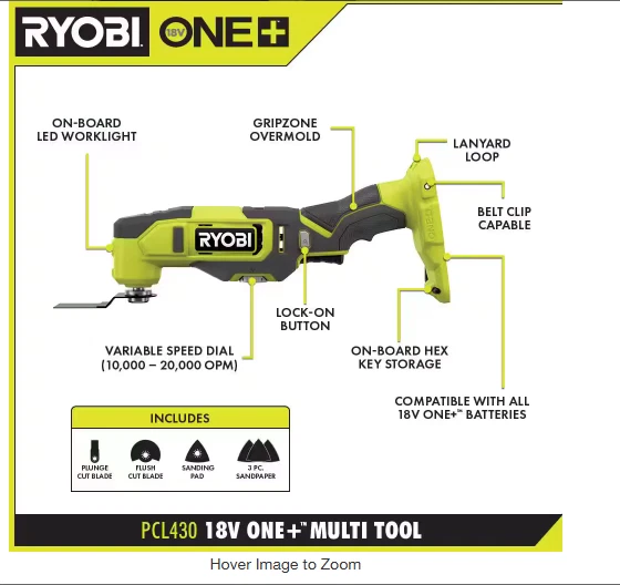 RYOBI 18V ONE+ Cordless 2-Tool Combo Kit: Multi-Tool & 5 in. Random Orbit Sander (Tools Only) RYOBI introduces the 18V ONE+ Cordless 2-Tool Combo Kit , featuring a Multi-Tool and a 5 in. Random Orbit Sander , designed to tackle a variety of demanding applications with ease. The 18V ONE+ Cordless Multi-Tool delivers up to 20,000 max OPM (Oscillations Per Minute) for fast and efficient cutting across multiple materials, including drywall, wood, metal, plastic, and composites. It features the lowest vibration in its class , reducing user fatigue and improving precision. The variable speed dial allows for customized performance, and the ergonomic design with a lock-on button enhances comfort during extended use. The 5 in. Random Orbit Sander operates at 10,000 OPM , ensuring a smooth, swirl-free finish on your work surfaces. Its ergonomic palm grip enhances user comfort, while the on-board dust collection bag keeps your workspace clean. The hook-and-loop accessory fastening system makes it easy to change sandpaper, and the lock-on switch allows for extended operation with less effort. This combo kit is part of the RYOBI ONE+ System , which includes over 300 cordless products that all work with the same battery platform, offering unmatched versatility. Includes: 18V ONE+ Cordless Multi-Tool (PCL430) with a plunge cut blade, finish cut blade, sanding pad, and (3) pieces of sandpaper assortment 18V ONE+ 5 in. Random Orbit Sander (P411) with an assortment of sandpaper of varying grits Operator’s manual 🔹 Battery and charger sold separately 🔹 3-Year Manufacturer's Warranty 🔹 Compatible with Electronic Recycling Programs