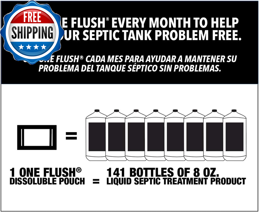 ONE FLUSH - Septic Tank Treatment Packets, 3-Month Supply of Easy-Flush Bacteria & Enzyme Packets - Proactive Prevention for Sewage Backups, Made in the USA 3-Month Supply: Each ONE FLUSH packet delivers a robust blend of natural enzymes and billions of bacteria cultures, specifically formulated for monthly use. This 3-month supply of septic treatment is designed to prevent backups and sustain optimal functionality of your septic tank system, ensuring long-term efficiency and reliability. Versatile Septic System Care: Ideal for septic tanks, greywater systems, cesspools, grease traps and lagoons, ONE FLUSH septic saver packets work with all plumbing systems, including boats, RVs and campers, ensuring optimal waste breakdown and odor control. All-Natural Septic Solution: Trust in an environmentally friendly septic tank cleaner that's free from harsh chemicals. Each packet is packed with bio-genetically engineered bacteria that safely digest fats, oils, and organic matter. Cost-Effective Septic Maintenance: Avoid expensive repairs with ONE FLUSH septic treatment packets. Their concentrated formula is not only budget-friendly but also equals the power of hundreds of liquid septic treatments. Easy-to-Use Septic Treatment: Simply drop one dissolvable ONE FLUSH packet into your toilet each month and flush away. No mess, no measuring, and no hassle – just a straightforward approach to septic tank care. Industrial-Strength for Home Use: Originally crafted for municipal waste treatment, ONE FLUSH brings industrial-grade septic tank treatment to your home, boasting a formulation strong enough to handle heavy-duty use but safe for everyday residential systems. Product Description ONE FLUSH septic system treatment is your best choice for all your septic system needs. Use ONE FLUSH septic tank treatment enzymes / bacteria to break down organic matter to stay effective and efficient. Every time you shower, brush your teeth, wash clothes or even dishes you send high concentrations of pollutants into your septic tank or greywater system. Today's antibacterial products, disinfectants, deodorant soaps, toilet bowl cleaners, bleach, and even mouthwash kill the beneficial bacteria that are needed to keep your septic system working properly. ONE FLUSH was originally designed for industrial and municipal waste treatment facilities. Each pre-measured, dissolvable packet contains 56 billion beneficial bacteria and eight different strains of bio-genetically engineered bacteria digest and biodegrade proteins, starches, fats and paper. Unlike ordinary bacteria, ONE FLUSH bacteria also digest and biodegrade today's antibacterial products, disinfectants, deodorant soaps, toilet bowl cleaners, bleach, and even mouthwash that kill the beneficial bacteria that are needed to keep your septic system working. The efficiency and versatility of ONE FLUSH also make it essential for preventing and solving many problems around the kitchen, bathroom, laundry room. ONE FLUSH septic treatment packets can be used for septic tanks and grey water systems, cesspools, dry wells, leach fields, drains, garbage disposals, grease traps, outhouses, RV, Camper, pit toilets and Manure pits, lagoons and even to make compost for your yard and garden. The ONE FLUSH septic system treatment will totally protect your entire septic system by simply flushing our product into your system Each month. ONE FLUSH is the most powerful and effective bacteria available on the market and is good for septic tanks up to 1500 gallons. A recent analysis revealed that 1 packet of ONE FLUSH septic treatment is equal to 141 bottles of a competitors 8 oz. Liquid septic tank treatment. From the Manufacturer A monthly maintenance approach using One Flush prevents problems, restores your system, biodegrades pollutants before they enter the environment. Easy to use and store, just drop and flush. Good for tanks up to 1500-Gallon. Shipping Fast shipping is very important for us. Our standard US shipping service is FREE. Your order will be shipped within 2-3 business days upon full payment received. Your order will be delivered within 2-3 business days after the handling time. We only ship to the confirmed PayPal address. We reserve the right to cancel any order for any reason at any time. We are not responsible for undeliverable addresses. Returns and payment We offer a 30 days return policy from checkout winning date. We allow only PayPal as payment method FeedBack Your feedback very important to us, after you get your package and you are satisfied with our service please leave us positive feedback If you have any problem with your order / any questions please before leave any type of feedback For any questions, using eBay contact system Please visit our eBay store to check out other items for sale! Thank you for shopping at our store.