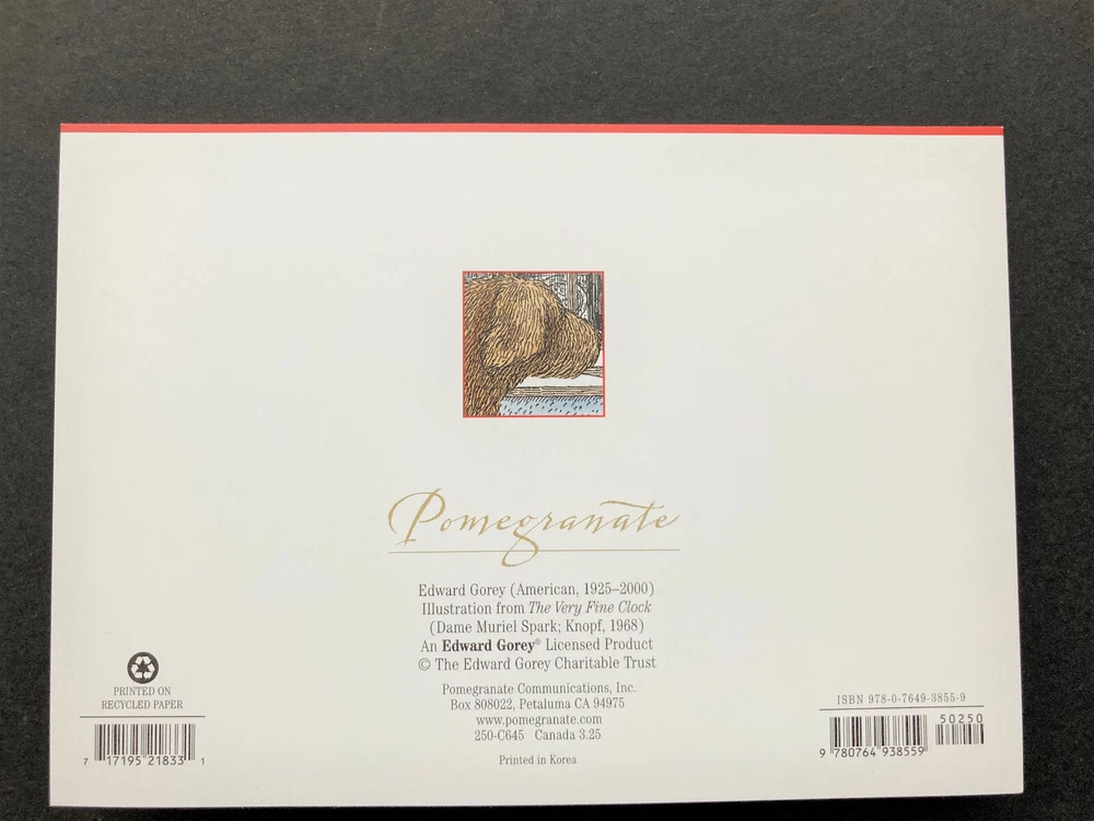 ONE single unused vintage large The Very Fine Clock Christmas/holiday season card with solid white envelope - Artwork by Edward Gorey (American, 1925-2000) depicts a man looking at a clock through a shop window; there is a large brown shaggy dog walking toward him on the sidewalk - No date is indicated on the card, but it shows Pomegranate's address as in Petaluma, CA, where Pomegranate was based until 2013 - Inside inscription: Season's Greetings - Like-new "vintage" condition from 2013 or earlier - 4-3/4 x 6-3/4 inches folded; printed on heavy card stock made from recycled paper - From a stock of loose cards; card will be sealed in a clear protective sleeve before being packed for shipment - SAVE $ if you order more than one of the cards in this listing (while supplies last)! To see how much your total would be, add desired number of cards to your cart, then go to your cart - items added to your cart can always be revised (quantity) or deleted. You will not be charged unless and until you check out. Check out our store for other Gorey cards and Gorey BOOKMARKS! - We do our best to offer you the most beautiful and extraordinary paper products we can find Save us as a seller - we frequently add new items QUESTIONS? Please don't hesitate to message us SHIPPING: Same or next business day by USPS first class / ground advantage mail. Shipped from a smoke-free environment. We are happy to combine shipping with other purchases from our store if reasonably feasible (in general, does not apply to free-shipping items); just message us. We routinely give partial refunds when appropriate for postage over-payment on multiple greeting card orders from more than one of our listings. PROBLEMS WITH YOUR ORDER? If you have any concerns or issues upon receiving your item, we ask that you message us directly so that a satisfactory solution can be found - We will respond as soon as possible. RETURNS: In the event of a return, buyer must return the item(s) in the same condition as when received. Buyer pays for return shipping, and the original shipping cost will not be refunded. Thanks for looking!