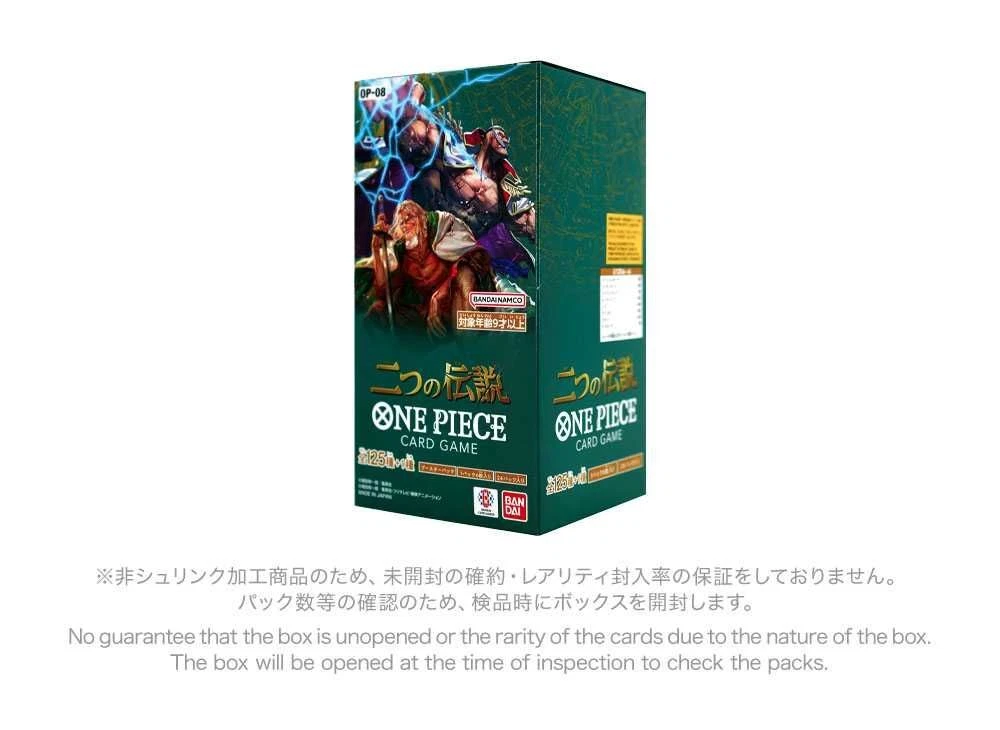 • Before purchasing, please read this page in conjunction with the notes at the bottom of the page, and by placing an order and making payment, you agree to be bound by the product conditions and notes. • International shipping will be facilitated through our central shipping center in Japan. Please allow approximately 10 business days for us to handle the item, from dispatching it from our local store to preparing it for international shipping in our central shipping center. • Tracking number will be provided only after the item reaches our central shipping center in Japan. • Item details and descriptions have been translated by AI, so occasional mistakes may occur. If you encounter any issues, please don't hesitate to reach out to us. PRODUCT INFORMATION Features Booster Character See Images Age Level Others Card Size Others Grade See Description Manufacturer Bandai Language Japanese Set Legends Game One Piece CCG Others ・Brand: ONE PIECE ・Item Condition: Brand New, Unused ・Release Date: 2024/05/25 ・Part number: OP-08 ・SNKRDUNK appraisers with expertise with tens of thousands or more appraisal records will carefully appraise. ・After clearing the authenticity test by an appraiser, we will deliver an authentic badge (seal) to the customer (only products that have been certified as genuine). Due to the nature of the product, we do not guarantee the rarity inclusion rate when purchasing packs. apparels/190553 ABOUT CONDITION Regarding Trading Cards: For sealed card packs, the distribution of rare cards cannot be guaranteed. A Gem Mint. (similar to PSA10) B Mint, minor scratches, damages or bents. (similar to PSA9-9.5) C Near Mint, slight scratches, damages or bents. (similar to PSA8) D Excellent or below, obvious scratches, damages or bents. (similar to PSA7 or below) About Us Sneaker Dunk (SNKRDUNK) is Japan's No. 1 sneaker and trading card flea market app, with over 6 million monthly users. Committed to authenticity, every item in each transaction undergoes thorough verification to prevent the distribution of counterfeit products, ensuring users can shop and trade with peace of mind. All items in SNKRDUNK are carefully inspected by experienced appraisal experts. Only genuine items will be given a certified label before being shipped to buyers. About Payment • Only eBay managed payments are accepted. • We do not do transactions outside of eBay. Shipping & Taxes • All items will be shipped via Japan Post with tracking service (EMS or ePacket). • All orders will be shipped from Japan to the registered address on the buyer's eBay account. • Shipments may be delayed due to bad weather, public holidays, customs office delays, and other conditions beyond our control. • All customs duties, import taxes or related fees occurred during shipping are the responsibilities of the buyer. If you have any concerns, please inquire directly with your local customs office before making a purchase. Return & Cancellation Policy • All listed items are also available at our retail store and multiple online platforms in Japan. In the event that an item is out of stock or sold, we will issue a cancellation along with a full refund. • If you wish to return an item for a refund, please contact us directly before initiating a return or opening a case. • For damaged items or discrepancies with the item description, please reach out to us directly within 10 days of receiving the item, providing pictures of the damaged area or issues. • Unless the item is damaged or does not match its description, buyers will be responsible for the return shipping fee. > All returns must be shipped to our address in Japan with a tracking number. > Refunds will be processed once the returned item has arrived safely. • Buyers who violate eBay policies or misuse eBay's Money Back Guarantee will be reported and blocked from future purchases. click here to see our store