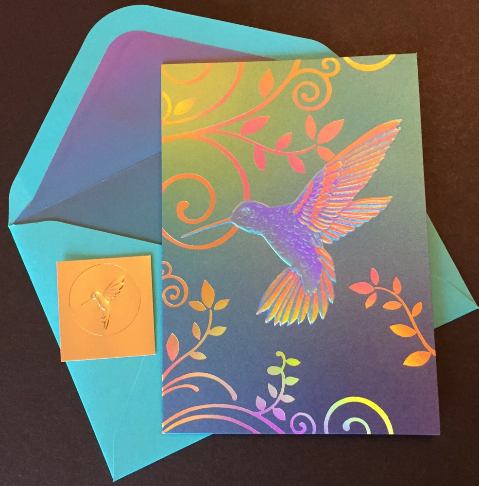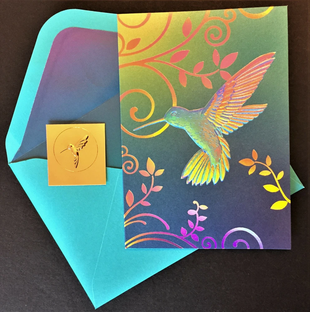 Our buyers' feedback on this item: Papyrus cards are always unusual and of good quality, and this beautiful notecard is a fine example of that. Wonderful selection of cards, and great communication from the seller. Kudos & thanks! :) 5⭐️seller! ✿ GREAT communication & FAST shipping! ✿ BEAUTIFUL card - Thank You! These cards are stunning! Super fast shipping! ONE SINGLE new Papyrus hummingbird blank note card with lined turquoise envelope and embossed gold foil seal - Delight someone by sending a note on this gorgeous card - Printed on heavy card stock with a foil finish that changes colors between blue, green, gold, and fuchsia - depending on the angle of the light - Card is blank inside; folded card measures 4 x 5-3/4 inches - From a stock of loose cards; card will be sealed in a clear protective sleeve before being packed for shipment Check out our store - We do our best to offer you the most beautiful and extraordinary paper products we can find Save us as a seller - we frequently add new items QUESTIONS? Please don't hesitate to message us SHIPPING: Your order will be shipped same or next business day by USPS first class / ground advantage mail. Shipped from a smoke-free environment. We are happy to combine shipping with other purchases from our store if reasonably feasible (in general, does not apply to free-shipping items); just message us. We routinely give partial refunds when appropriate for postage over-payment on multiple greeting card orders placed at the same time from more than one of our listings. PROBLEMS WITH YOUR ORDER? If you have any concerns or issues upon receiving your item, we ask that you message us directly so that a satisfactory solution can be found - We will respond as soon as possible. RETURNS: In the event of a return, buyer must return the item(s) in the same condition as when received. Buyer pays for return shipping, and the original shipping cost will not be refunded. Thanks for looking!