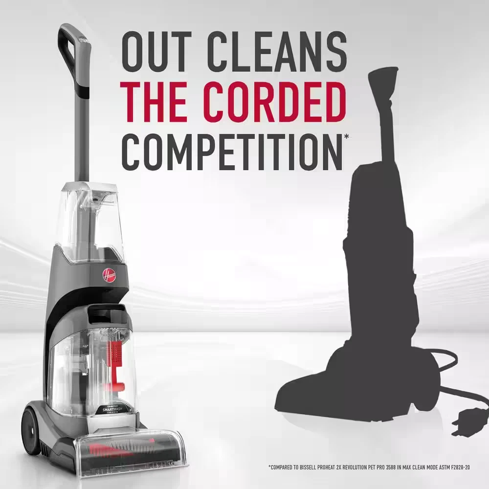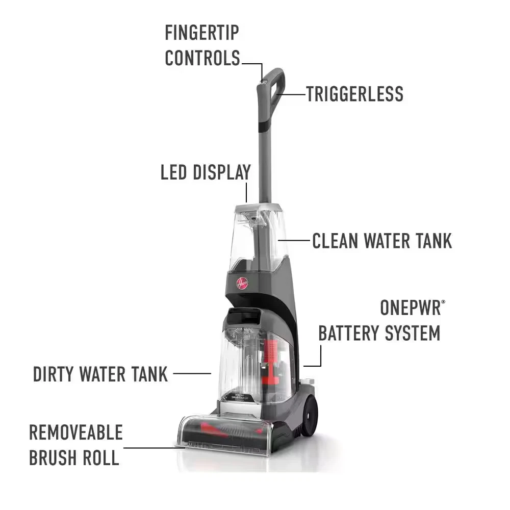 Fast Shipping On All Items 30 Days Money Guarantee Customer Support Excellent Service 100% Satisfaction Satisfaction Guaranteed ONEPWR SmartWash Automatic Cordless Upright Carpet Cleaner Machine, Deep Clean Carpet Shampooer with Battery and Charger Specification Amperage (A) 200 A Appliance Category Floor Care Appliance Series Not Applicable Brush Types Included Brushroll Bundling Options Battery,Charger Carpet Cleaner Type Upright Carpet Cleaners Cleaning Path Width (in) 10 in Cleaning Tank Capacity (gallons) 0.625 Collecting Tank Capacity (gallons) 0.5 Color Family Black Commercial/Residential Residential Cord Length (ft) 0 ft Cordless/Corded Cordless Floor Care Features See-Through Water Tank,Shampoo,Wet/Dry Horsepower (hp) 0 hp Included Accessories Batteries,Charger,Cleaning solution Material Plastic Noise Level (dB) 0 Number of Attachments 2 Number of Wheels 2 Product Weight (lb) 15 lb Recommended Surfaces Carpet Returnable 90-Day Voltage (v) 18v Certifications and Listings AHAM Certified Manufacturer Warranty 3 Year Limited Warranty Product Depth (in) 18 in Product Height (in) 23 in Product Width (in) 18 in 18.0 inches x 18.0 inches x 23.0 inches. Weight: 15.0 lb Item Description Powerful cordless carpet cleaner machine Automatic cleaning technology senses when to wash and dry Tackle deep, set-in stains with spot mode Hoover ONEPWR SmartWash is the world's first cordless carpet cleaner, packed with advanced and intuitive tech to out clean even the leading corded competition*. This powerful carpet cleaner combines triggerless, automatic cleaning technology-automatically sensing when to wash and dry -with TruMAX Technology for extended cleaning sessions. Tackle deep, set-in stains effortlessly with the Spot Mode, while tool-free and hassle-free cleanup is ensured with the removable dirty water tank lid, nozzle, and brush roll. Elevate your cleaning routine with the convenience of cordless power and intelligent features, backed by the most advanced cordless cleaning network in the world.*Compared to Bissell ProHeat 2X Revolution Pet Pro 3588 in MAX Clean Mode ASTM F2828-20 POWERFUL & CORDLESS: Enjoy powerful cleaning and extraction with the convenience of cordless cleaning CORDLESS CLEANING: Out cleans the leading corded competition**Compared to Bissell ProHeat 2X Revolution Pet Pro 3588 in MAX Clean Mode ASTM F2828-20 AUTOMATIC CLEANING TECHNOLOGY: ONEPWR SmartWash automatically senses when to wash and dry SPOT MODE: Get an extra burst of power to tackle deep, set-in stains DRY ONLY MODE: Dry floors more quickly and get back to life quicker TRUMAX TECHNOLOGY: Clean farther and take less trips to the sink. TruMAX Technology allows for more dirty water to be captured before the tank needs to be emptied HASSLE-FREE CLEAN-UP: Removable dirty water tank lid, nozzle and brush roll make clean-up easy About us We offer the best prices around on high quality products. Our E-store includes media such as books, movies, music and games while offering electronics, toys, sporting apparel, clothing, tools, general home, garden items and more. Shipping We are always working hard to ensure your package arrives as soon as possible. Please understand that some factors like weather, high postal traffic, and the performance of shipping companies are outside of our control. We offer free shipping to the lower 48 states and ship within 2-3 business days of payment, usually sooner. We do not accept P.O. Boxes. Please provide a physical address. For shipping outside of the continental USA, we only use eBay's Global Shipping Program.The item is shipped to KY and then sent to the rest of the world. International customers are responsible for all duties and taxes. Continue to check out to calculate costs for shipping the item to your country. Messages regarding eBay's Global Shipping Program MUST be directed at eBay EXCLUSIVELY. Returns We offer a 30-Day Return Policy on items in which you are not completely satisfied with. You have the option of a full-refund or an exchange of the item. No returns are available on items shipped outside of the USA Satisfaction We try over very best to make sure every customer is completely satisfied. If there's a problem, message us! We're happy to help. Payment Options Shop With Confidence