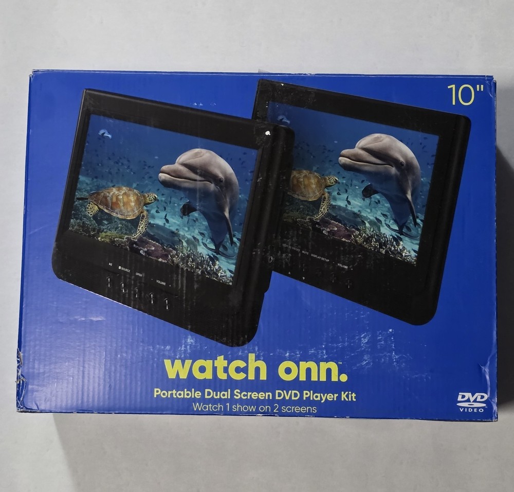 Condition: Open box item that appears to have been used. ***Missing remote control*** Onn 10" Dual Screen Portable DVD Player Kit with Storage Bag Stereo headphone jack DC power input on primary and secondary unit DC power output on primary unit Digital volume control Display on/off switch Mute button Built-in stereo speakers 2 10" TFT LCD color displays DVD player: DVD, DVD±R/RW on primary unit CD player: CD, CD-R/RW - enjoy your favorite discs 1024 x 600 native resolution Aspect ratio: 16:9 Multi-language on-screen display V-chip - parental controls/viewer controls Included: 3.5mm audio/video cable, DC to DC connection cable, 2 set of earbuds, AC/DC power adapter, 12 V DC car adapter, 2 headrest straps, carry ****NO REMOTE CONTROL***