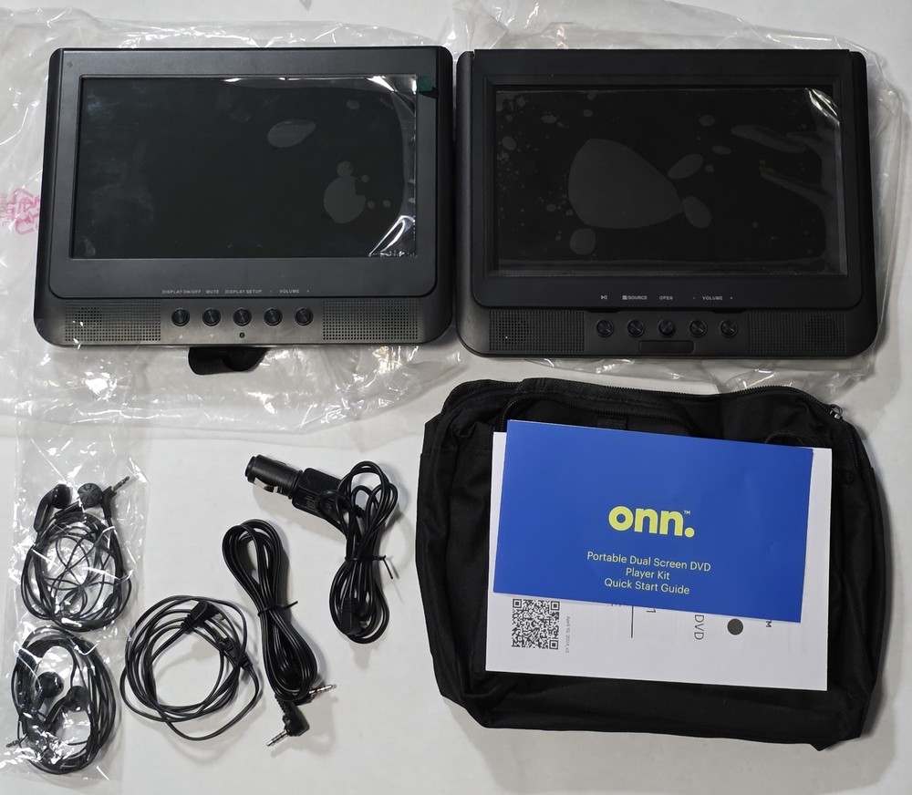 This ONN dual-screen DVD player is a fantastic deal for families on the go! Even though it's an open-box item missing the remote, the dual 10" screens work perfectly for keeping kids entertained during road trips. The picture quality is crisp, the built-in speakers sound great, and having individual headphone jacks is super convenient. Love that it comes with a storage bag too - makes traveling with it so much easier. For the price, this portable entertainment system can't be beat!