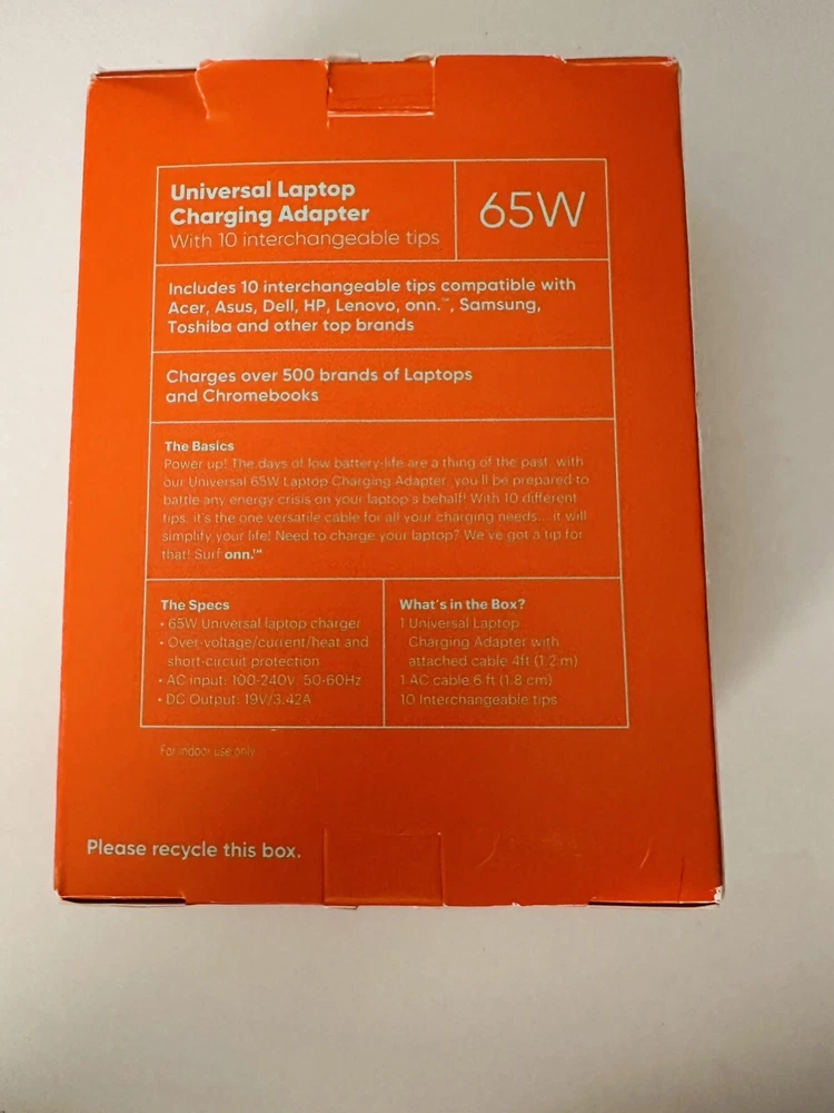 Voltage:19 VCompatible Brand:For Panasonic, Universal, For Samsung, For Sony, For Acer, For Sylvania, For ASUS, For Dell, For IBM, For Lenovo, For Toshiba, For HPgtin13:0681131308847Output Current:3.42 AColor:GrayItem Length:4.09in.Type:Power AdapterItem Height:1.16in.Compatible Product Line:Universal, For ChromebookBrand:ONNCompatible Model:Apple MacBook Pro A1398, Dell Inspiron 13 5378, Acer Chromebook 11, Acer Chromebook C710, Acer Chromebook C720, Acer Chromebase, Dell Inspiron 11 3162, Apple MacBook A1181, Dell Inspiron 11 3164UPC:0681131308847Item Width:2.09in.MPN:100004335