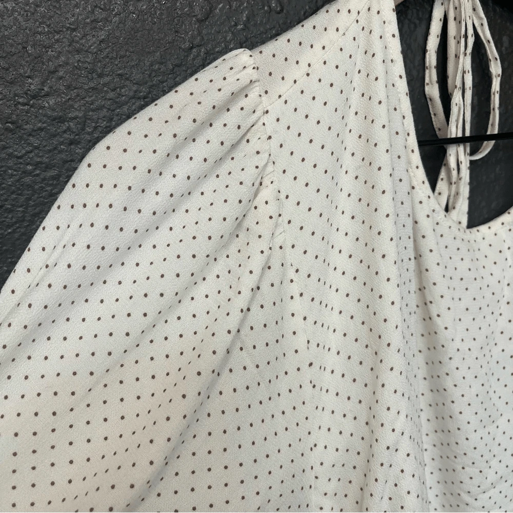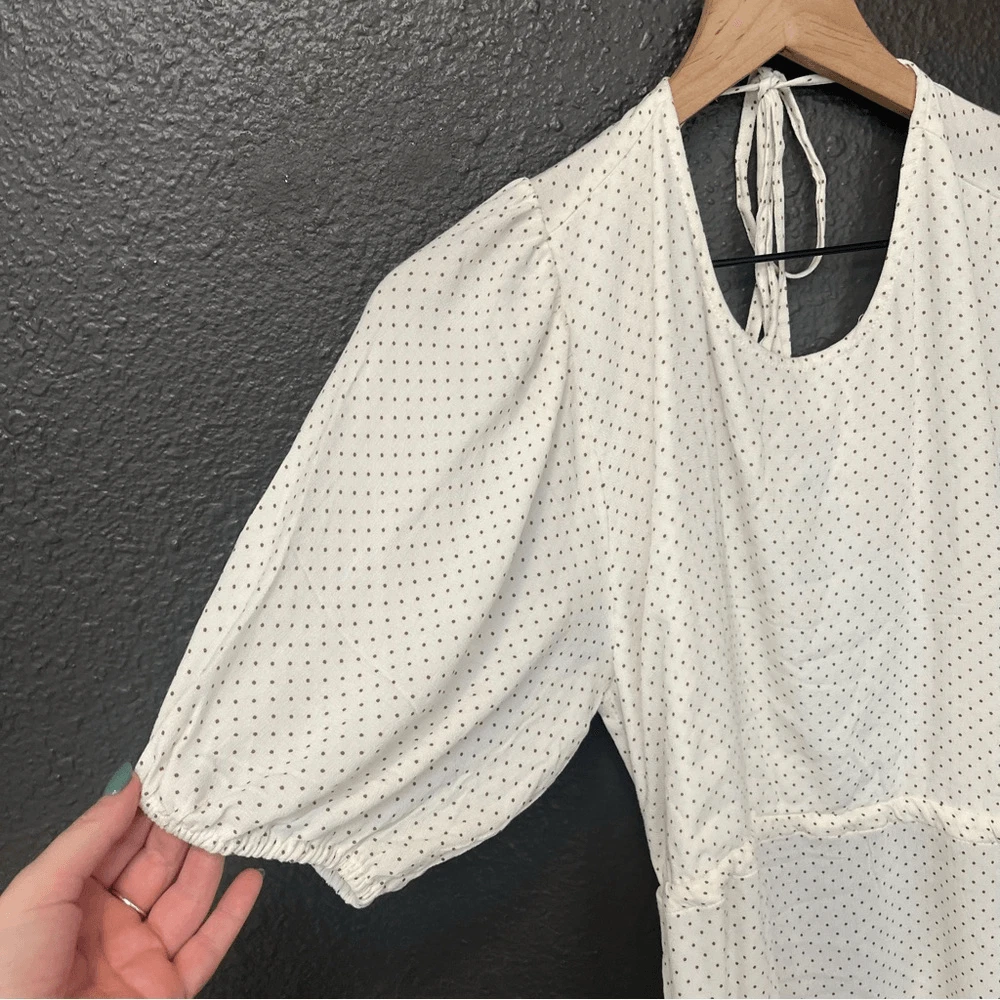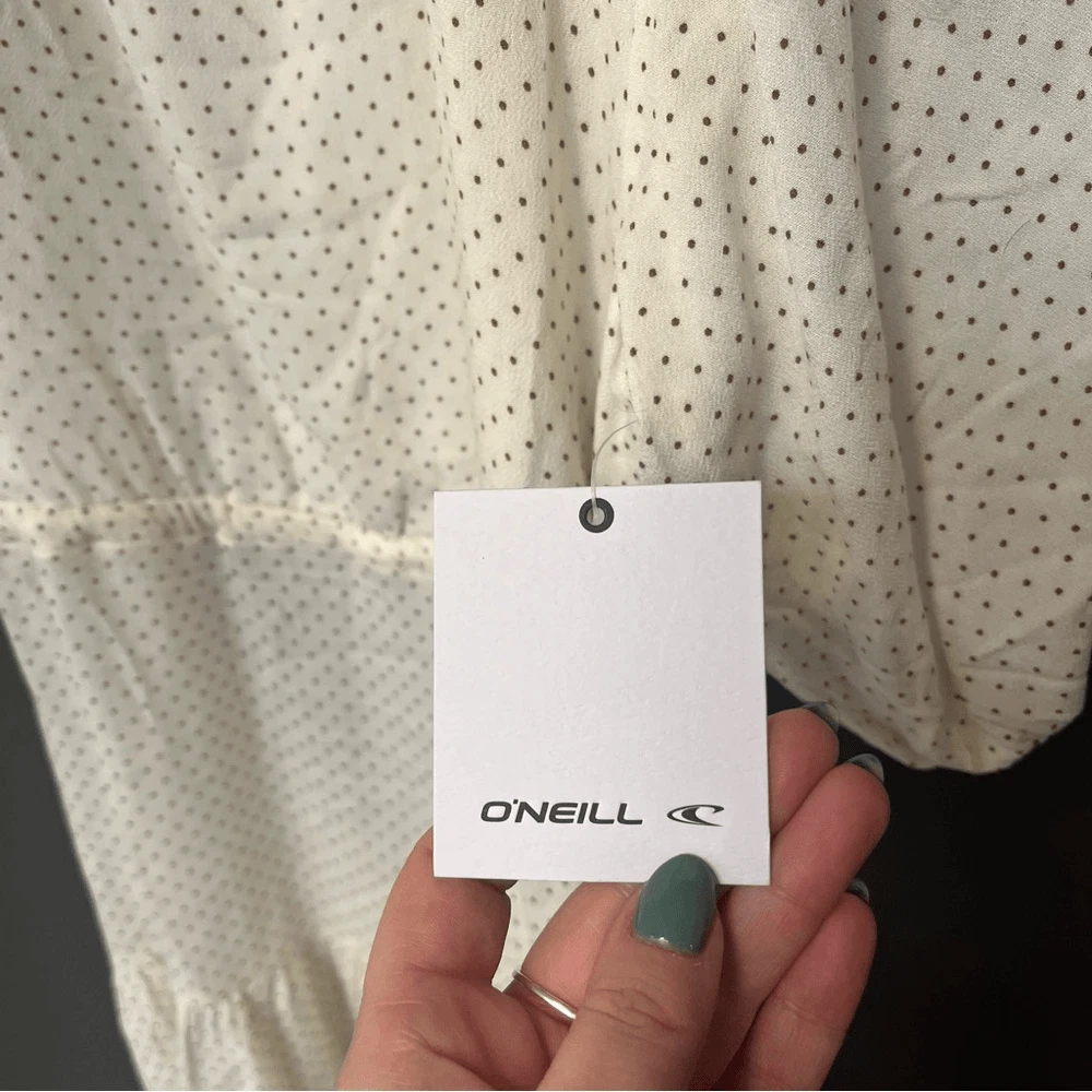 O’Neill Alta Dot Print Open Back Minidress NEW with tags Size Large Color: Winter White True to size. XS=0, S=2-4, M=6-8, L=10-12, XL=14. A perfect pin-dot print covers this chic open-back mini styled with a ruffled skirt and elbow-length puff sleeves. Jewel neck Elbow-length sleeves 95% viscose, 5% elastane DSTS
