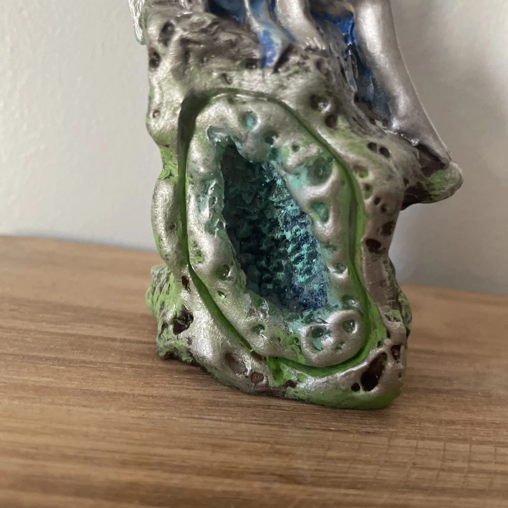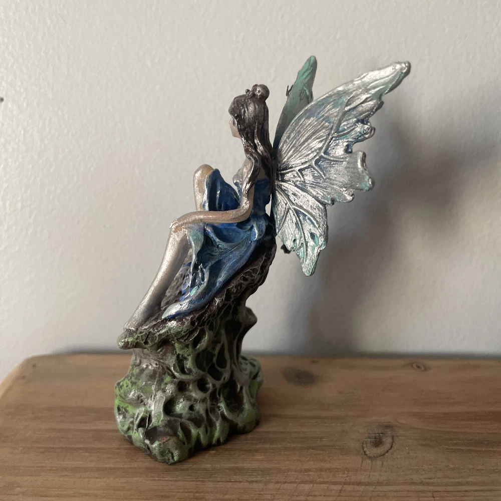 OOAK Blue Gothic Alt Dark Fairy Repaint Statue Sitting Resin Craft Ornament. Originally a Myrtle Beach souvenir fairy sculpture. Has been repainted. The Myrtle Beach sticker can be removed. The wing underneath the sticker is unpainted. The crystal in the statue is not a real crystal. Perfect for fairy collectors, fairy gardens, and home decor. Not recommended for outdoor use.