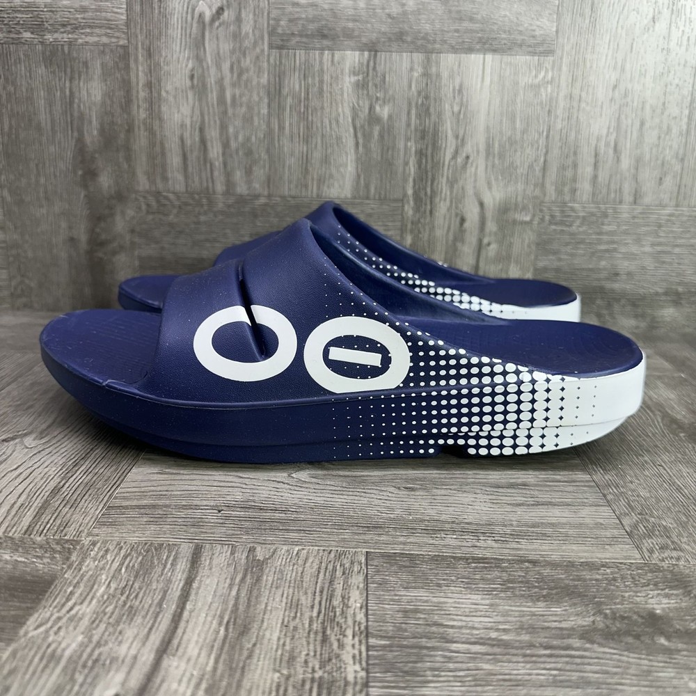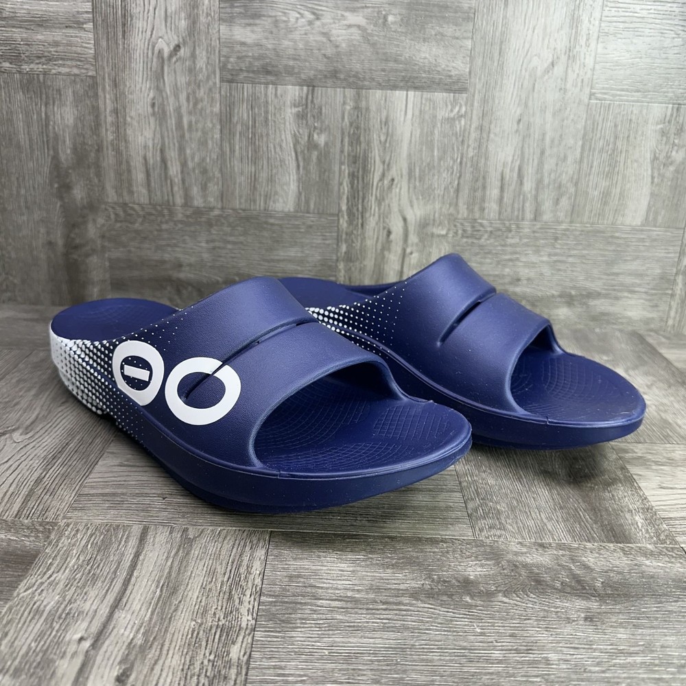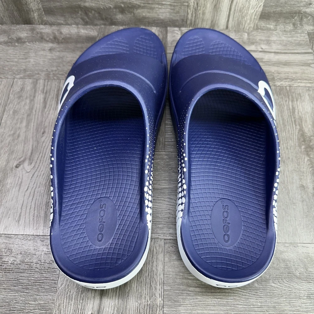 The OOFOS 1500 OOahh Men's Comfort Slides in Navy Matrix are a stylish and comfortable option for men's activewear or casual sandals. With a slip-on closure and rubber upper and insole, these slides offer easy wear and a cushioned feel. The solid blue color, synthetic lining, and logo accents add a sporty touch to the design. Perfect for summer, fall, and spring seasons, these Vietnamese-made sandals are a must-have for those looking for both style and comfort in their footwear.