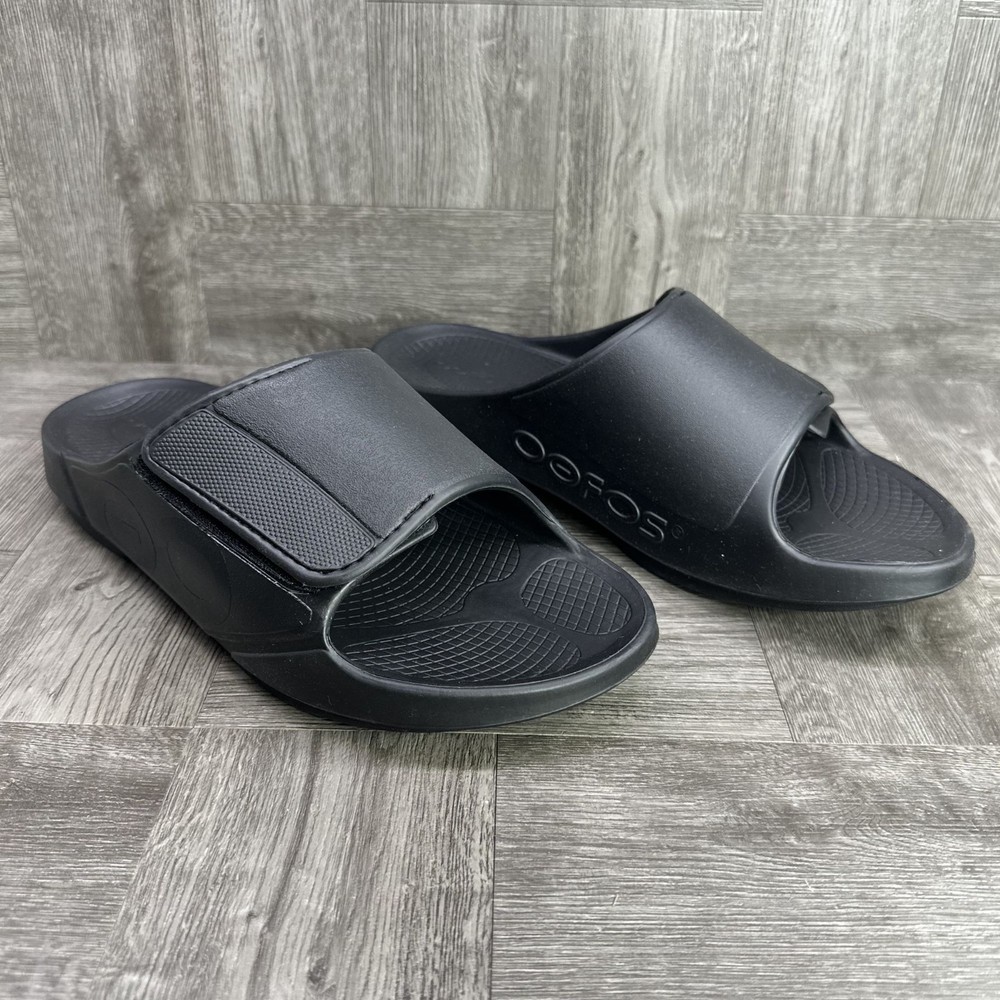 The OOFOS OOahh Sport Flex Men's Slides in size 11/EURO 44 Black are a comfortable and stylish footwear option for men. With a slip-on closure, rubber outsole, and synthetic lining material, these sandals are perfect for activewear or casual occasions during the summer, fall, and spring seasons. Featuring the signature OOFOS logo accent and a solid black color, these slides offer a sporty theme and standard shoe width. Made with synthetic upper material and a rubber insole, these OOFOS sandals provide a comfortable and durable option for men looking for a versatile and practical footwear choice.