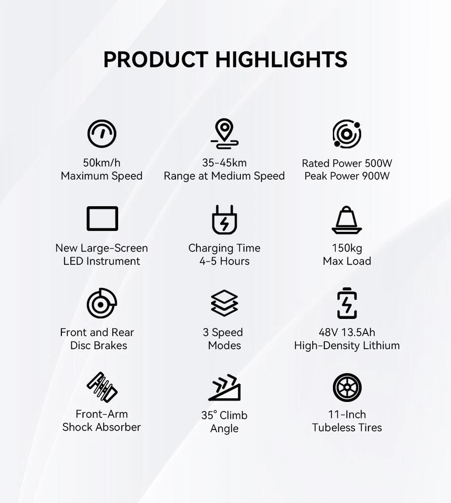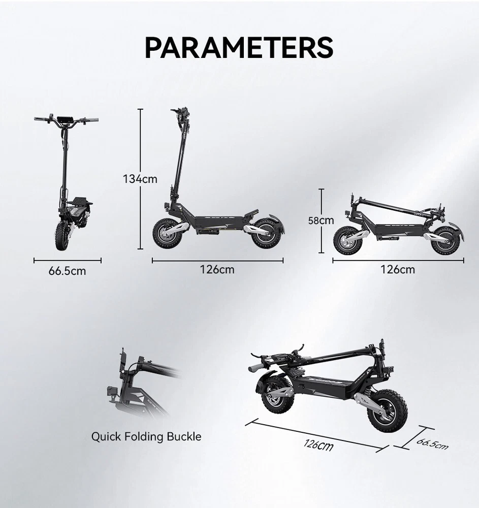 OOTD T10 900W Peak Electric Scooter 11" Off Road Foldable E Scooter 31MPH 28Miles 500W Motor (900W Peak) | Conquer 35° Slopes - Equips a 500W high-efficiency motor (peak 900W) that easily climbs 35° slopes (equivalent to underground garage gradients). Features Eco/Low/High 3-speed modes with a speed limit of 31Mph, meeting energy-saving commutes, city rides, and racing needs. Energy output efficiency is 27% higher than similar products. 28Miles Real Range | 3A Fast Charging - 48V13.5Ah automotive-grade lithium battery delivers 28Miles range. Supports 3A fast charging (4-5hrs full charge). Ideal for 2-day commutes (14Miles/day) – no more 8-hour charging waits. 50CM Anti-slip Deck | 330lb Max Load - 50×21cm Extra-Long Anti-Slip Deck (Industry Avg: 40cm) | Aluminum cover plate with silica-gel grip | 330lb Max Load. Supports stable short rides for two adults. One-click Folding | 3s Compact Size - Patented locking mechanism enables instant folding with a single press. Folded size fits car trunks effortlessly, 60% faster than traditional screw-based systems – truly "fold and go". Dual 140MM Disc Brakes | Reliable Stopping - Front/Rear 140mm Ventilated Disc Brakes + Sintered Metal Pads. Delivers efficient braking at 31Mph/h on dry roads. Dual-channel independent braking system prevents single-brake overheating. 270° Turn Signals | Emergency Brake Flashing - LED arrow turn signals cover 270° of side/rear blind spots with clear 30-meter nighttime visibility. The innovative synchronized dual-brake light flashing function: rapid taillight flashing during emergency braking, with tested results showing shortened rear vehicle reaction time and 46% reduced lane-changing risk at intersections. 160° Wide Headlight | Rain Safety Beam - The front dual LED headlights illuminate a 4-lane width (160° wide-angle). Built-in high-volume emergency horn can be quickly activated during rain/fog conditions. Dual Spring Suspension | Smooth Off-road Ride - Both front and rear wheels feature reinforced spring shock absorbers. Tests show when passing 8cm potholes at 31Mph/h, vibration intensity is reduced by 55% compared to non-suspension models, providing more comfortable riding over speed bumps. Hand vibration is reduced to 33% of ordinary scooters, allowing fatigue-free wrist comfort for 2-hour continuous rides. Package Contents: Electric Scooter×1 Wrenches: 5mm wrench ×1, 6mm wrench ×1 Multi-function Wrenches: 2.5mm, 3mm, 4mm, 5mm ×1 each Spare Wrenches: Open-end wrench ×2 Brake Pads: 2 pairs Manuals: User Manual ×1, InstallationManual ×1 Charger: 3A ×1 On Jul 16, 2025 at 11:05:04 PDT, seller added the following information: