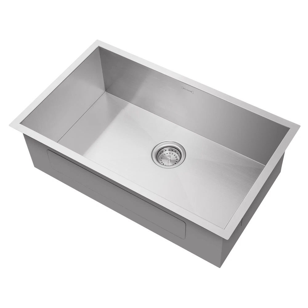 OPEN BOX - Stainless Steel Single Bowl Undermount Kitchen Sink Basin NOTICE THIS IS AN OPEN BOX DISCOUNTED ITEM. ORIGINAL CARDBOARD BOX MAY HAVE MARKS AND SCUFFS FROM PRIOR TRANSIT OR PRODUCT MAY HAVE BEEN REPACKAGED. PICTURES SHOWN ARE STOCK IMAGES OF A NEW UNIT, NOT ACTUAL PICTURES OF ITEM FOR SALE. PLEASE READ CONDITION NOTES AND DESCRIPTION OF ACTUAL ITEM FOR SALE PRIOR TO PURCHASE!!! Notes Reason for Discount: Used Open Box Item - Customer Return Functionality: Tested and working Cosmetic Condition: Used, Very Good Condition. Used product may have minor scratches, scuffs or small dents. Will be shipped in original or repackaged box. MODERN STYLING: Combining the best in function and design, this finely crafted single bowl sink features a gorgeous & durable satin-finish and precision-engineered, zero radius corners for a modern look as well as maximizing the sink work area. SUPERIOR CRAFTMANSHIP: Crafted from top-quality 18-gauge, 304 (18/10) stainless steel, this commercial-grade material provides lasting durability, which helps to maintain a beautiful appearance and lasting appeal. SUPERIOR FUNCTIONALITY: Subtle integral channels at the sink bottom help food debris flow toward the drain. ULTRA-QUIET DESIGN: Each sink is built with best of class soundproofing technology to minimize excess noise and vibration from water, garbage disposals, pots, pans and utensils. INCLUDES DRAIN: Sink includes a basket strainer drain, printed mounting instructions and an installation template. Overall dimensions (flange-to-flange): 30" wide (recommended 33" minimum sink base cabinet) x 18" front-to-back. Interior bowl dimensions: 28" wide x 16" front-to-back x 10" deep. Fast shipping! Most orders ship out the same business day by FedEx, USPS or DHL Global Mail Expedited. Our eBay Store | Terms of Sale Visit our eBay store to shop our full selection of products.